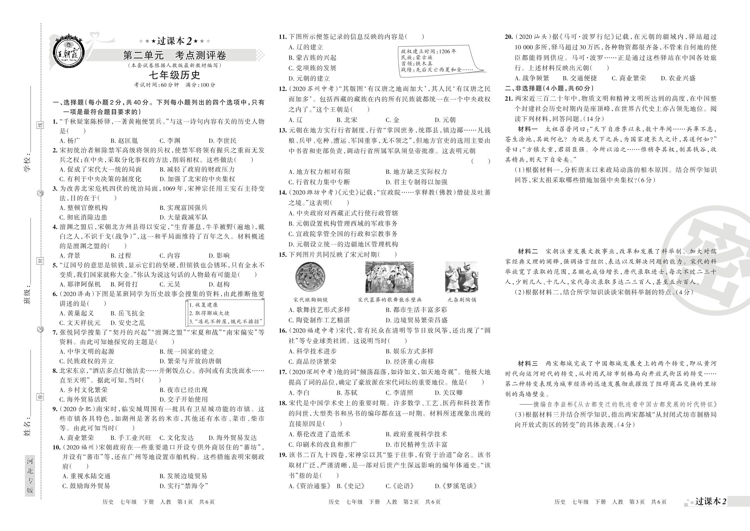 王朝霞期末过课本——第二单元 考点测评卷七年级下册历史(人教版)【0】