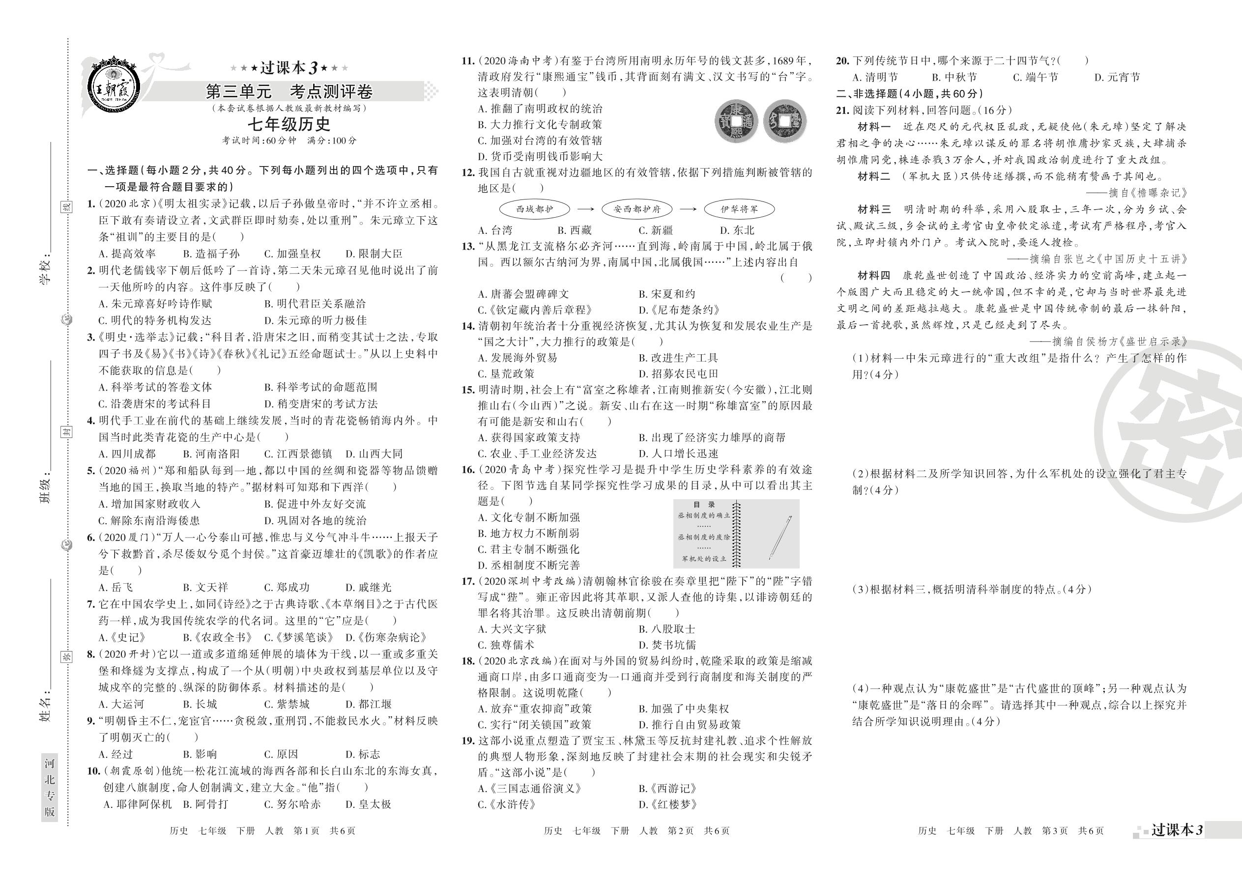 王朝霞期末过课本——第三单元 考点测评卷七年级下册历史(人教版)【0】