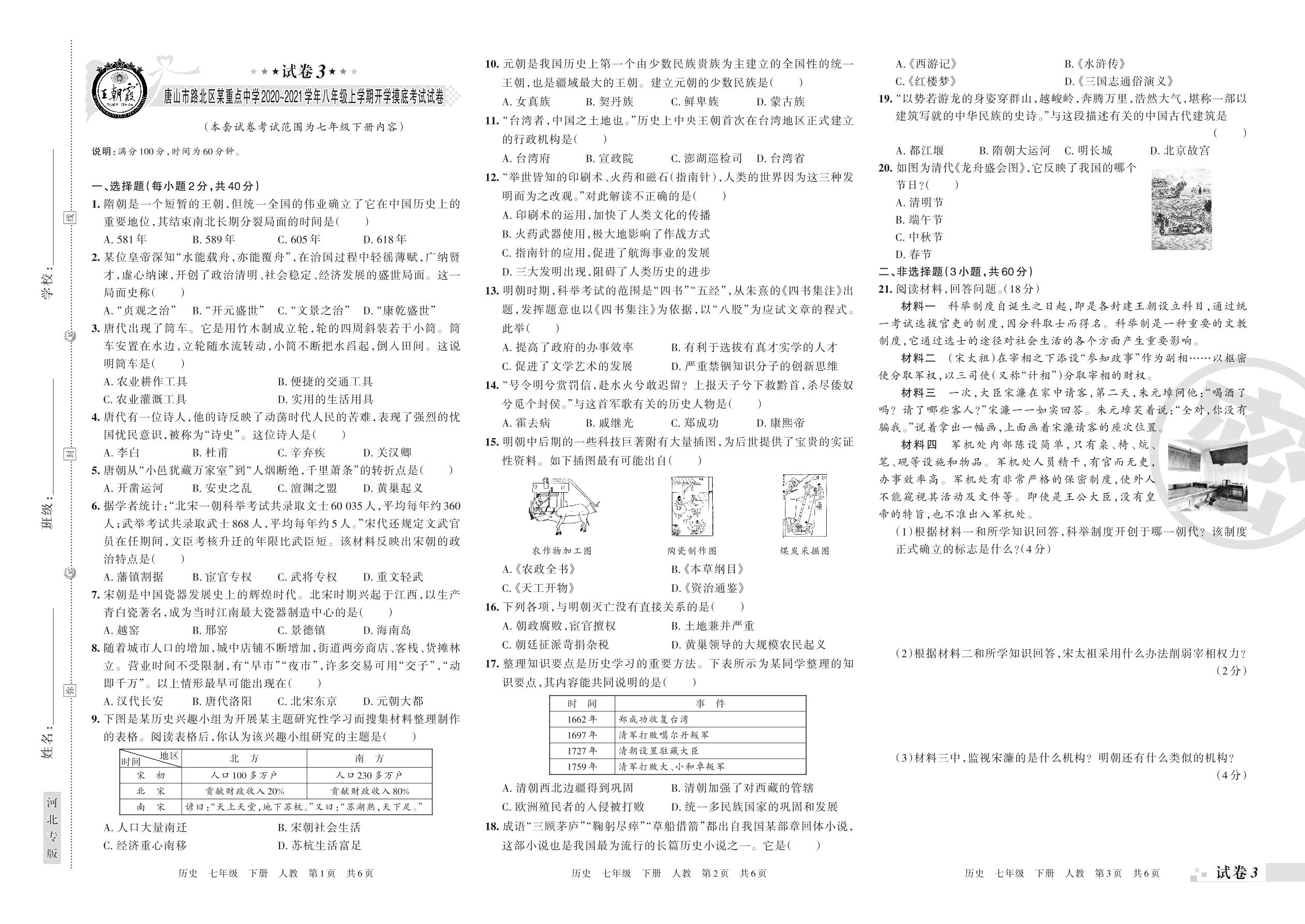 2019-2020学年第二学期唐山市路北区七年级历史试卷(人教版)【3】