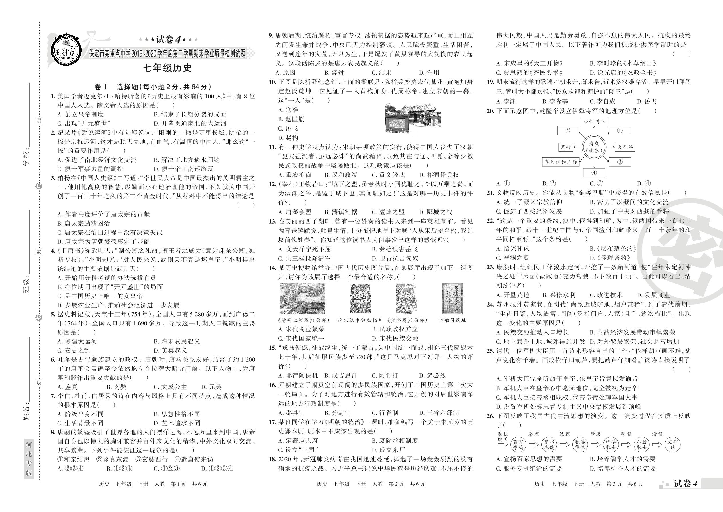 2019-2020学年第二学期保定市七年级历史试卷(人教版)【4】