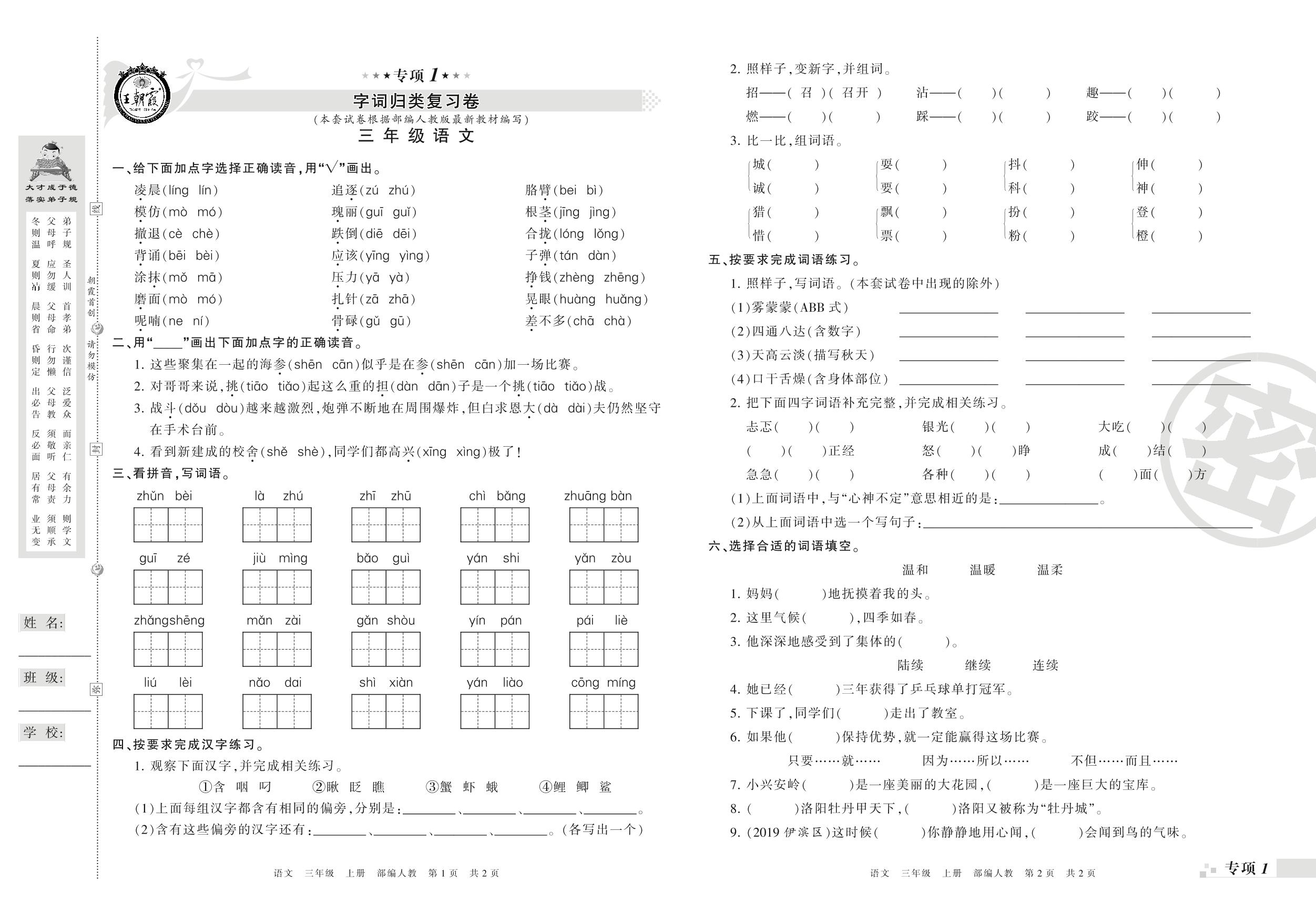 王朝霞期末专项卷——字词、句子与口语交际真题归类复习卷三年级上册语文(人教版)_R21080192213【0】