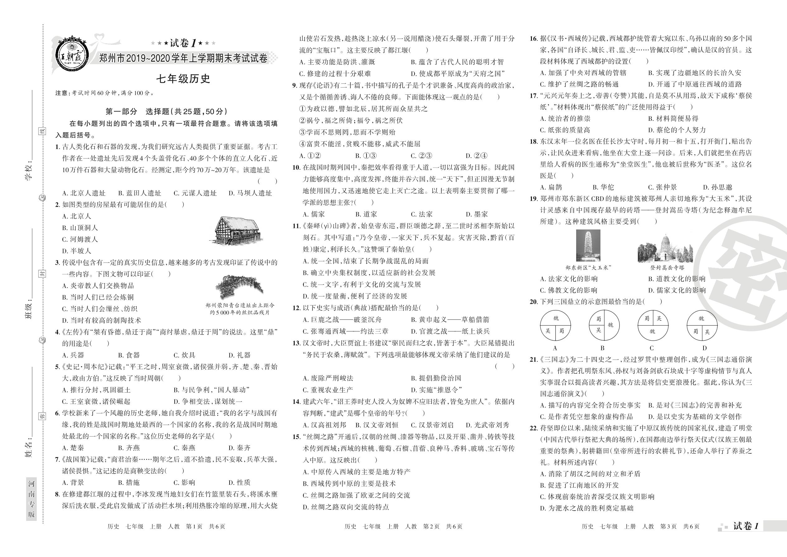 2019-2020学年第一学期郑州市七年级历史试卷(人教版)【1】