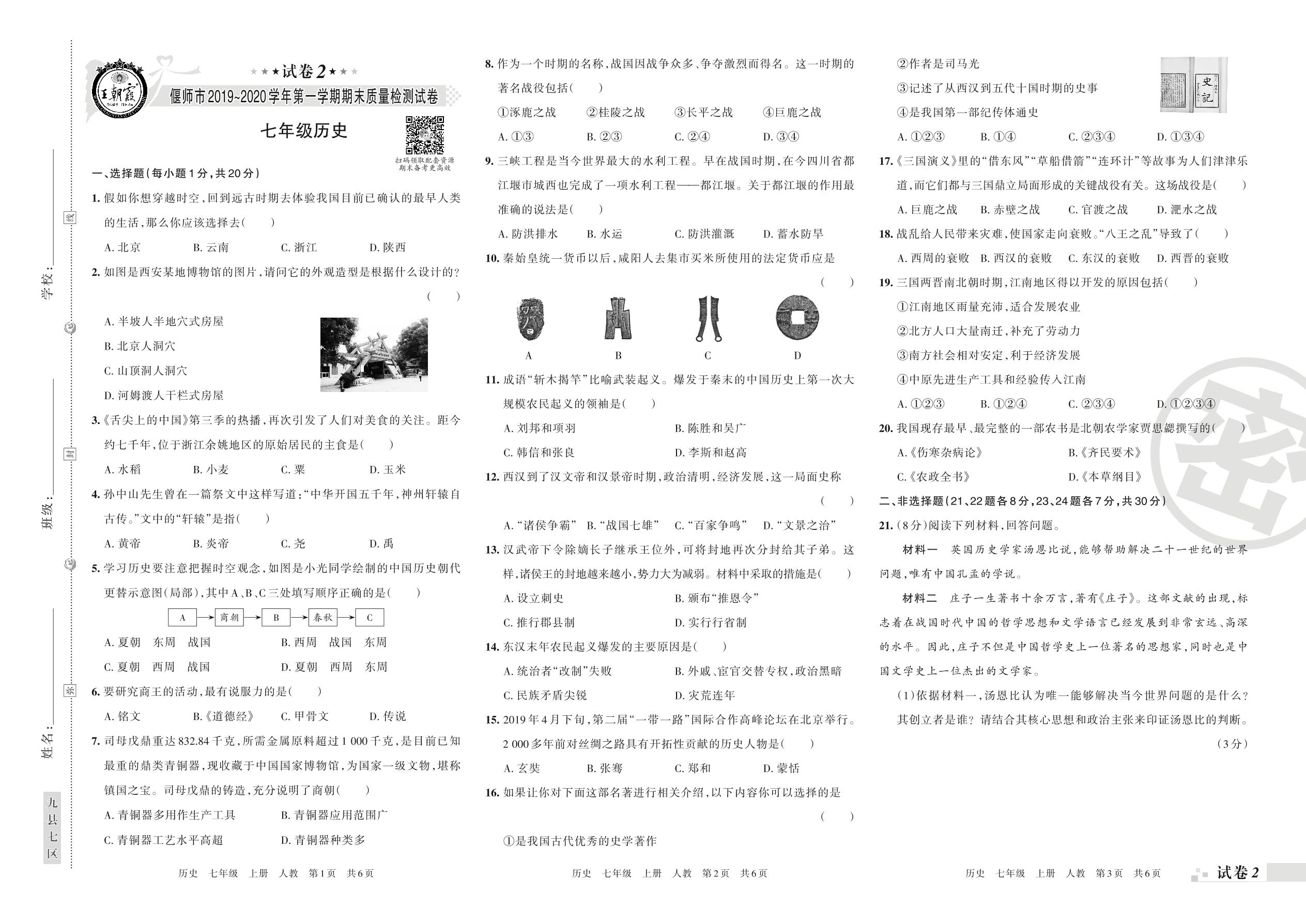 2019-2020学年第一学期偃师市七年级历史试卷(人教版)【2】