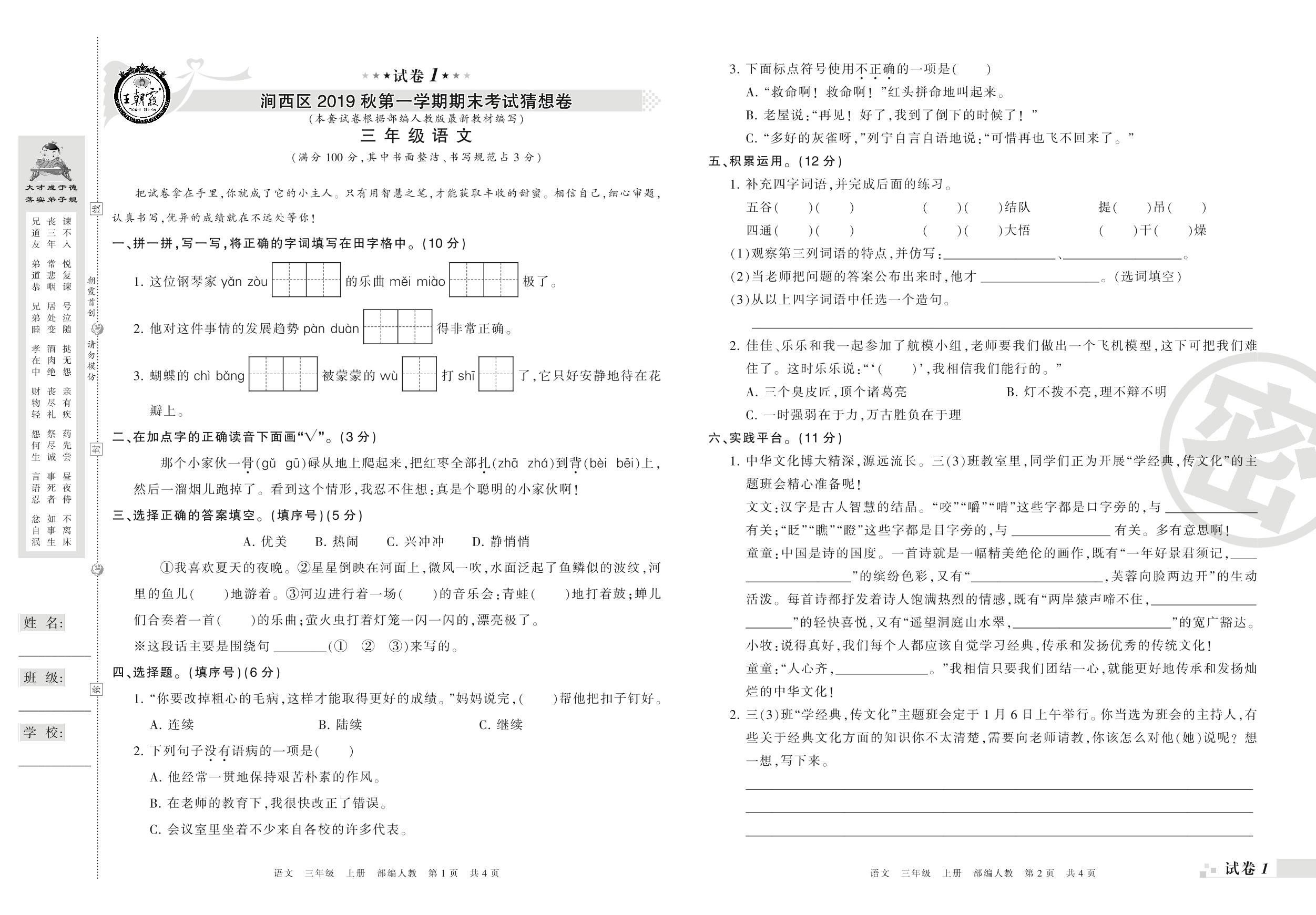 2018-2019学年第一学期洛阳市涧西区猜想卷三年级语文试卷(人教版)【1】