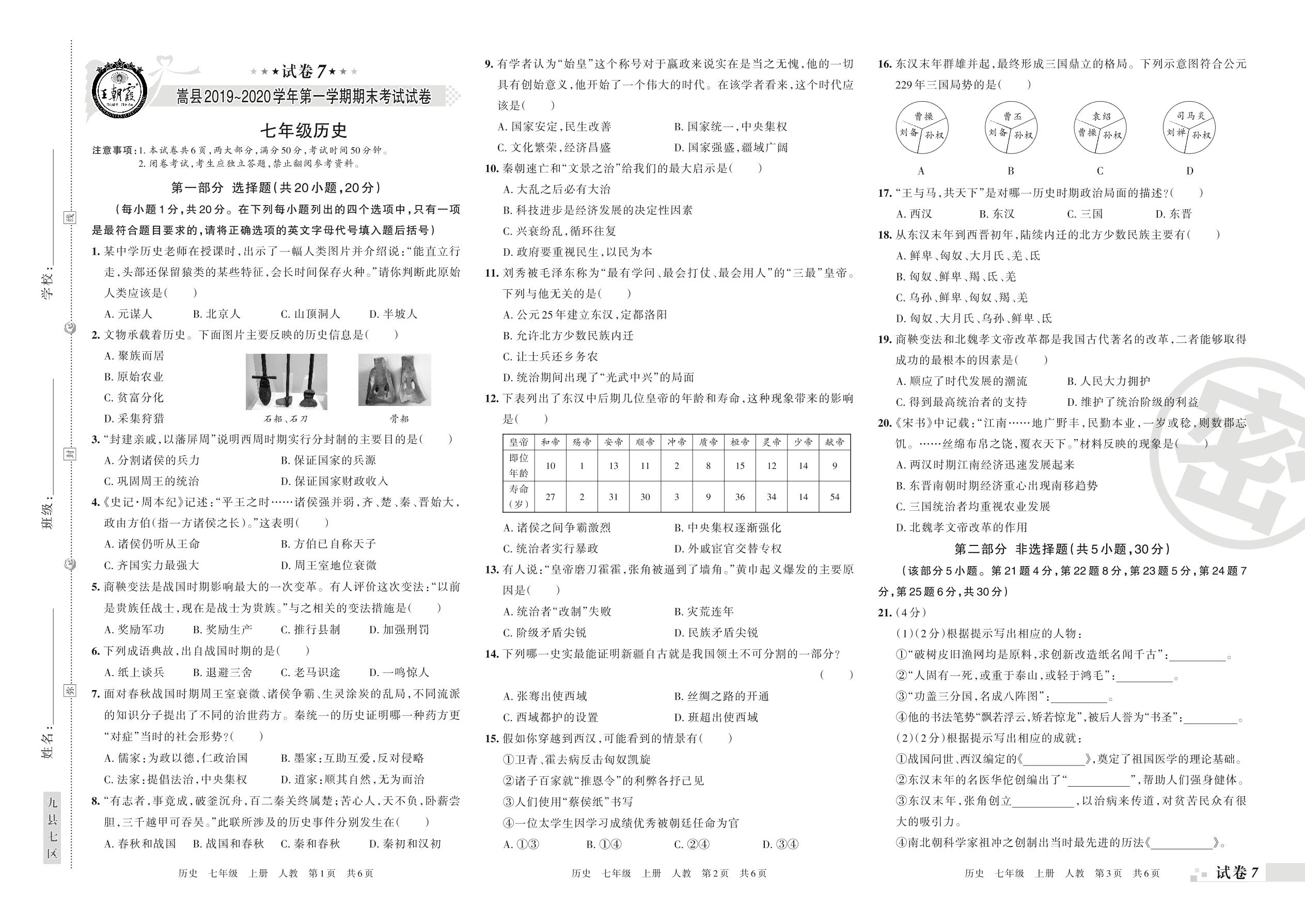 2019-2020学年第一学期洛阳市嵩县七年级历史试卷(人教版)【7】