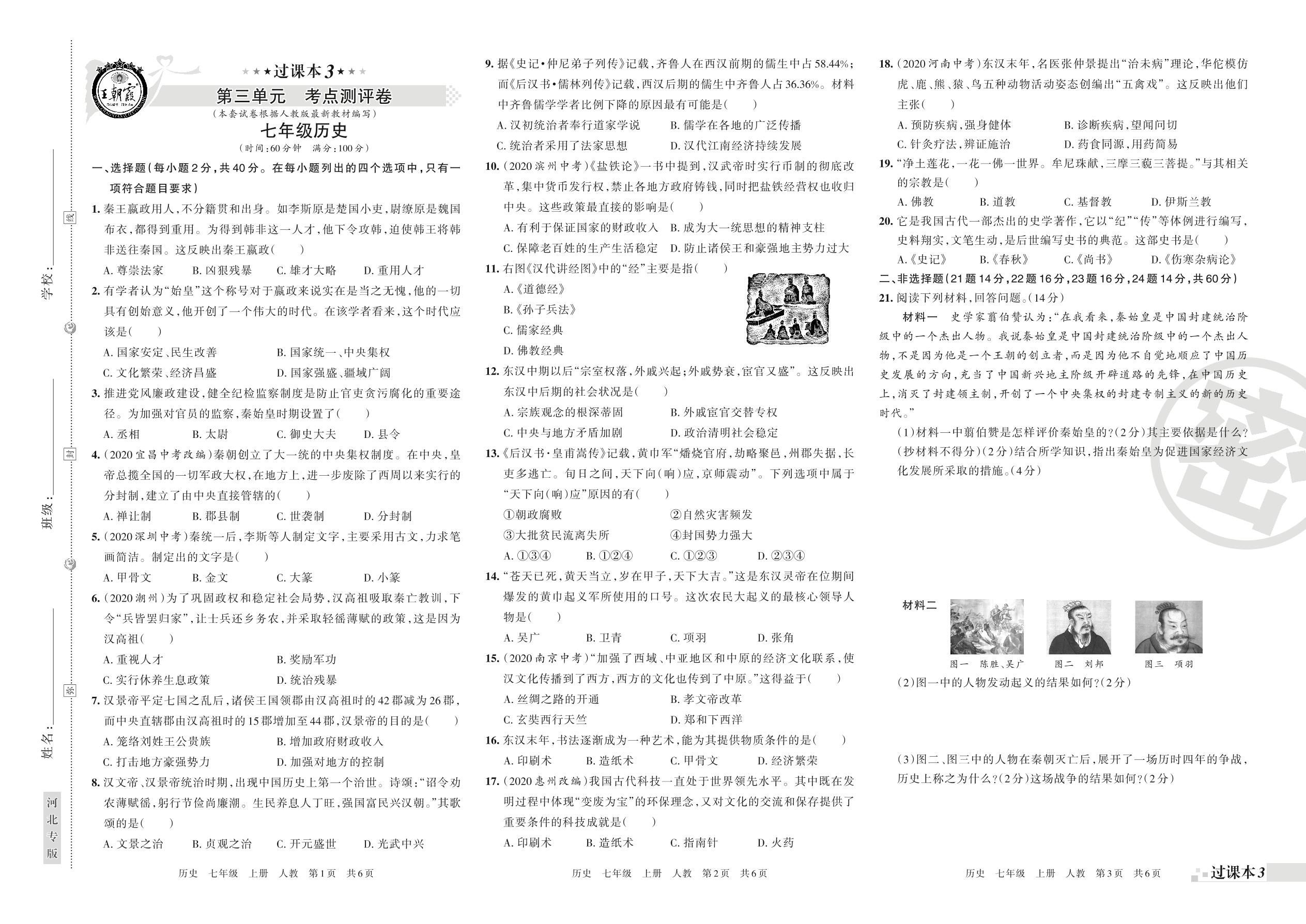 王朝霞期末过课本——第三单元考点测评七年级上册历史(人教版)【0】