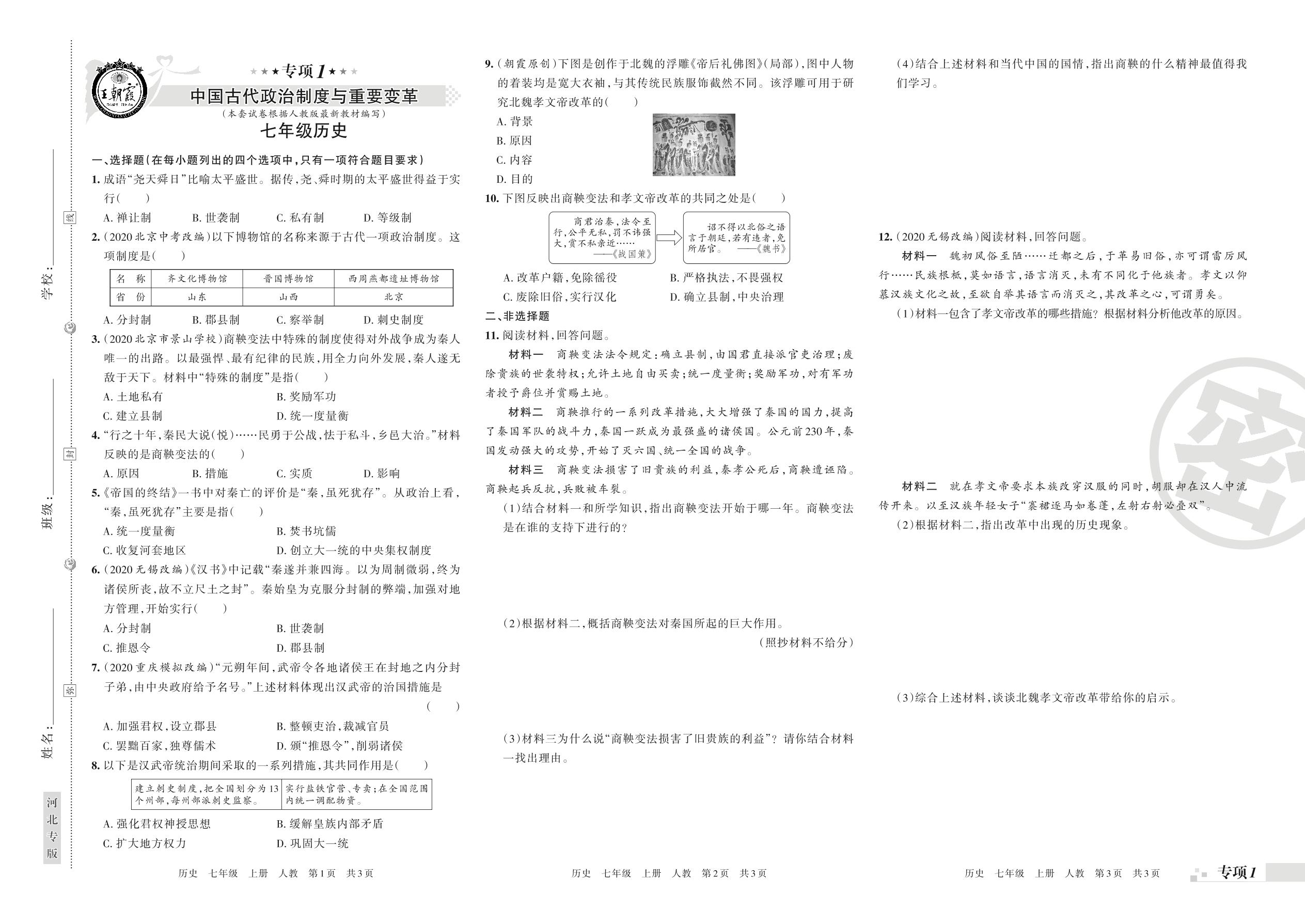 七年级历史人教版上册专项卷