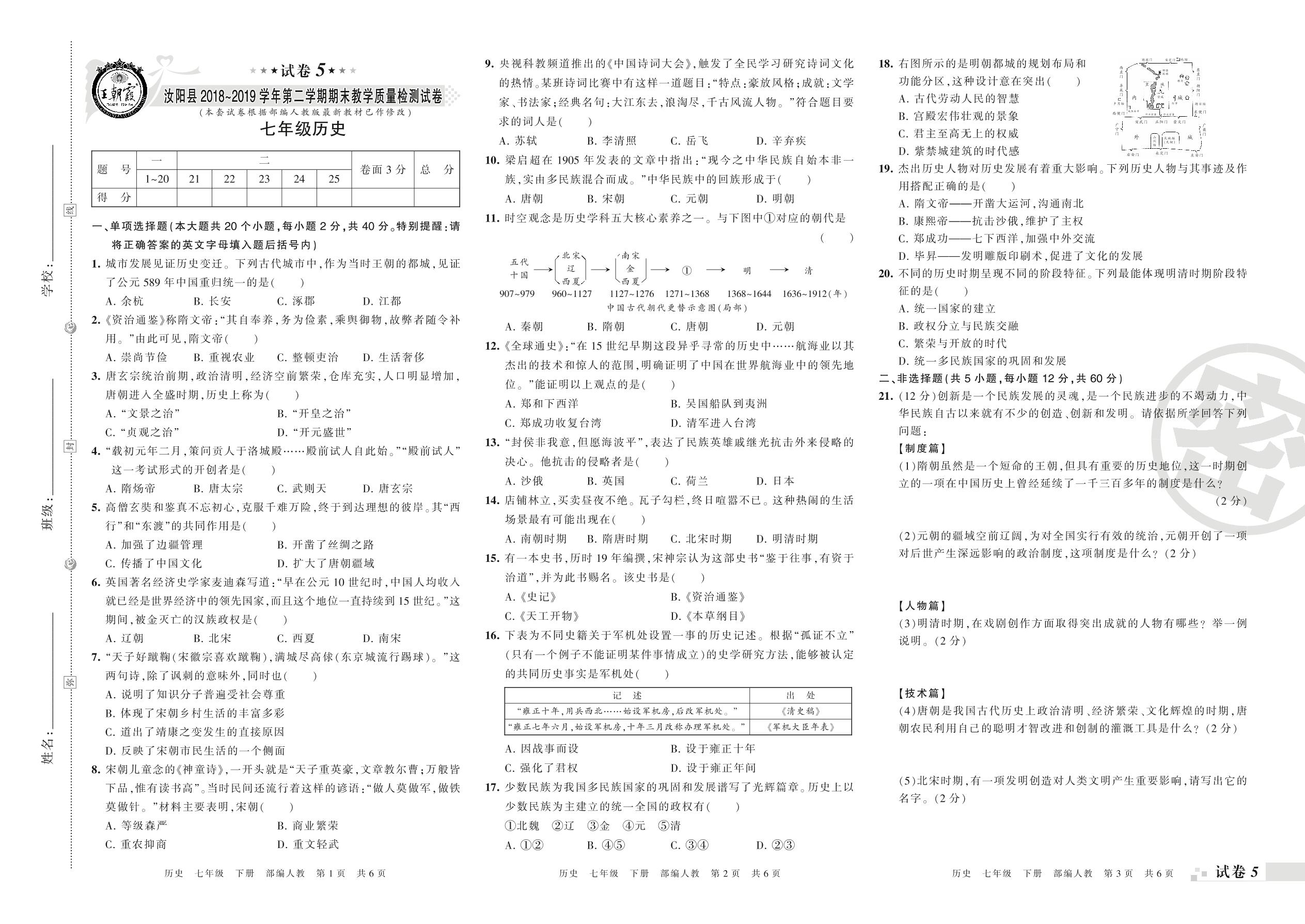 2018-2019学年第二学期洛阳市汝阳县七年级历史试卷(人教版)【5】