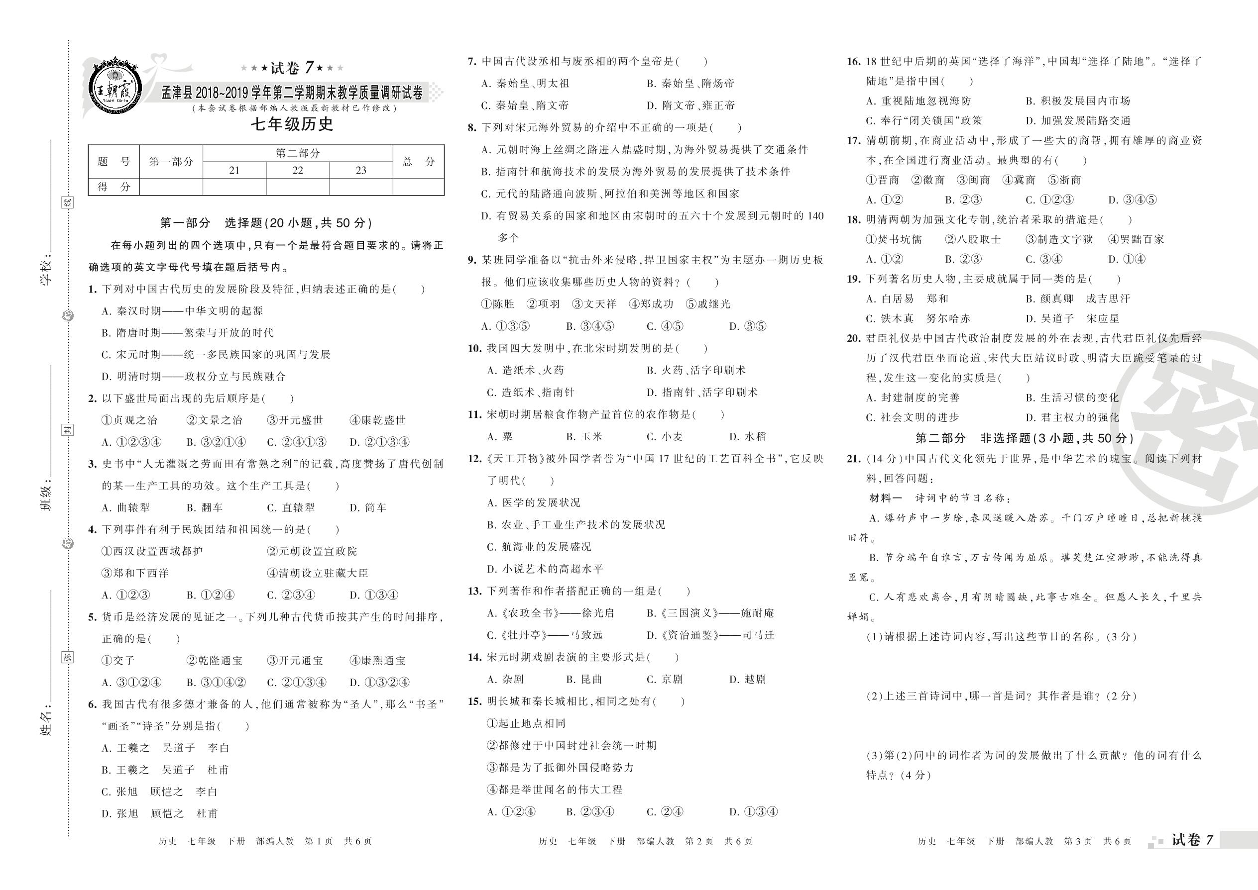 2018-2019学年第二学期洛阳市孟津县七年级历史试卷(人教版)【7】