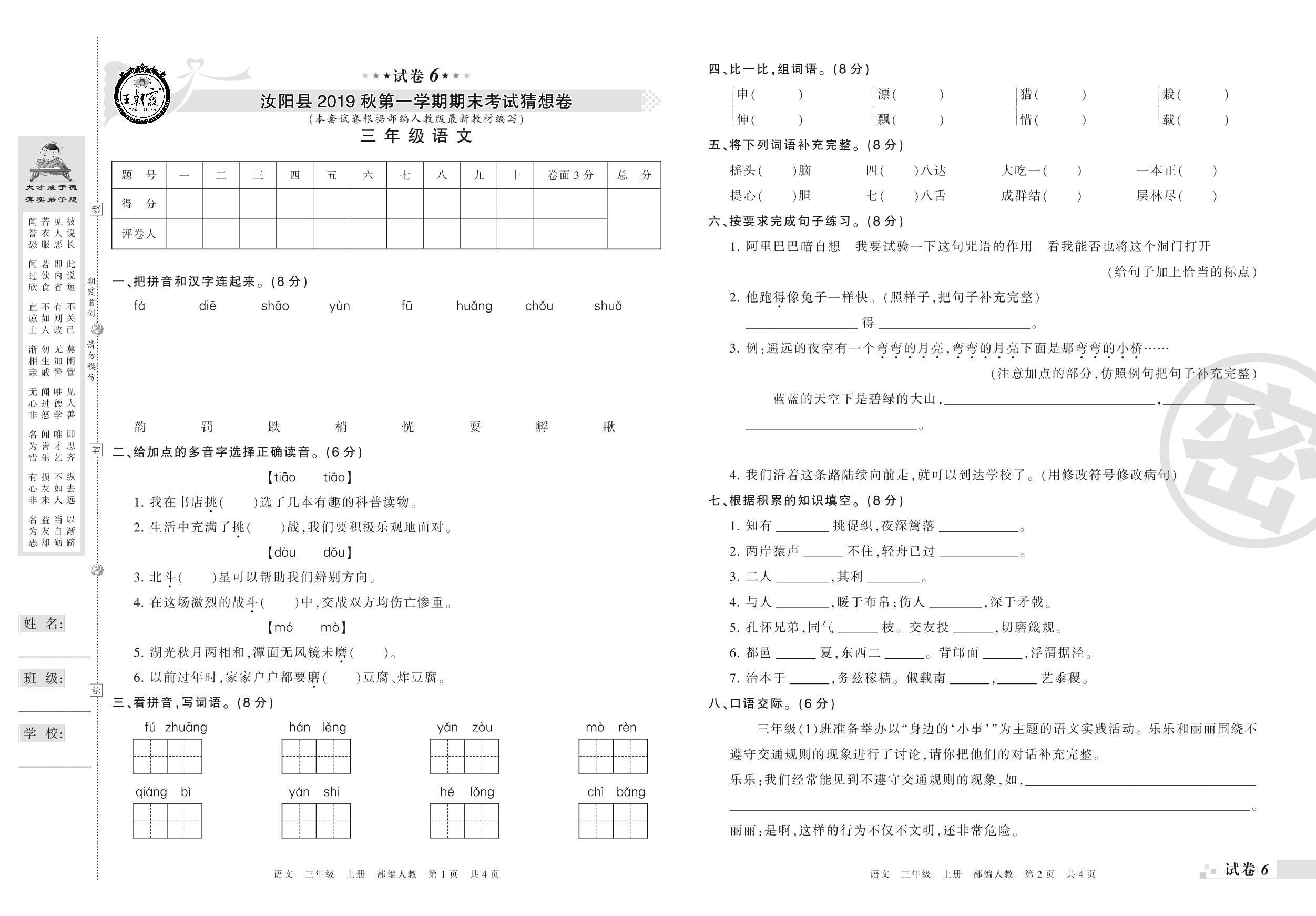 2018-2019学年第一学期洛阳市汝阳县猜想卷三年级语文试卷(人教版)【6】