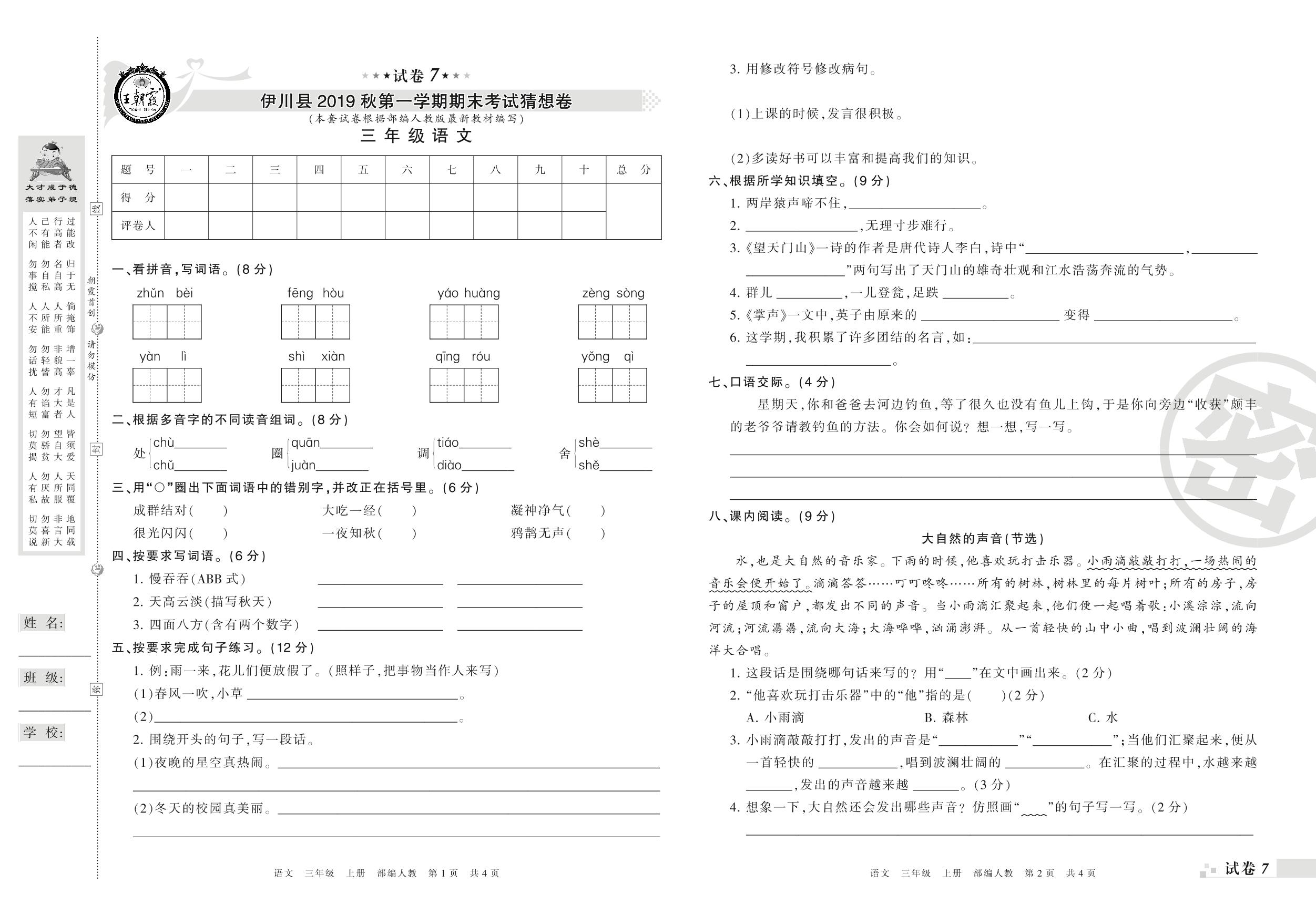 2018-2019学年第一学期洛阳市伊川县猜想卷三年级语文试卷(人教版)【7】