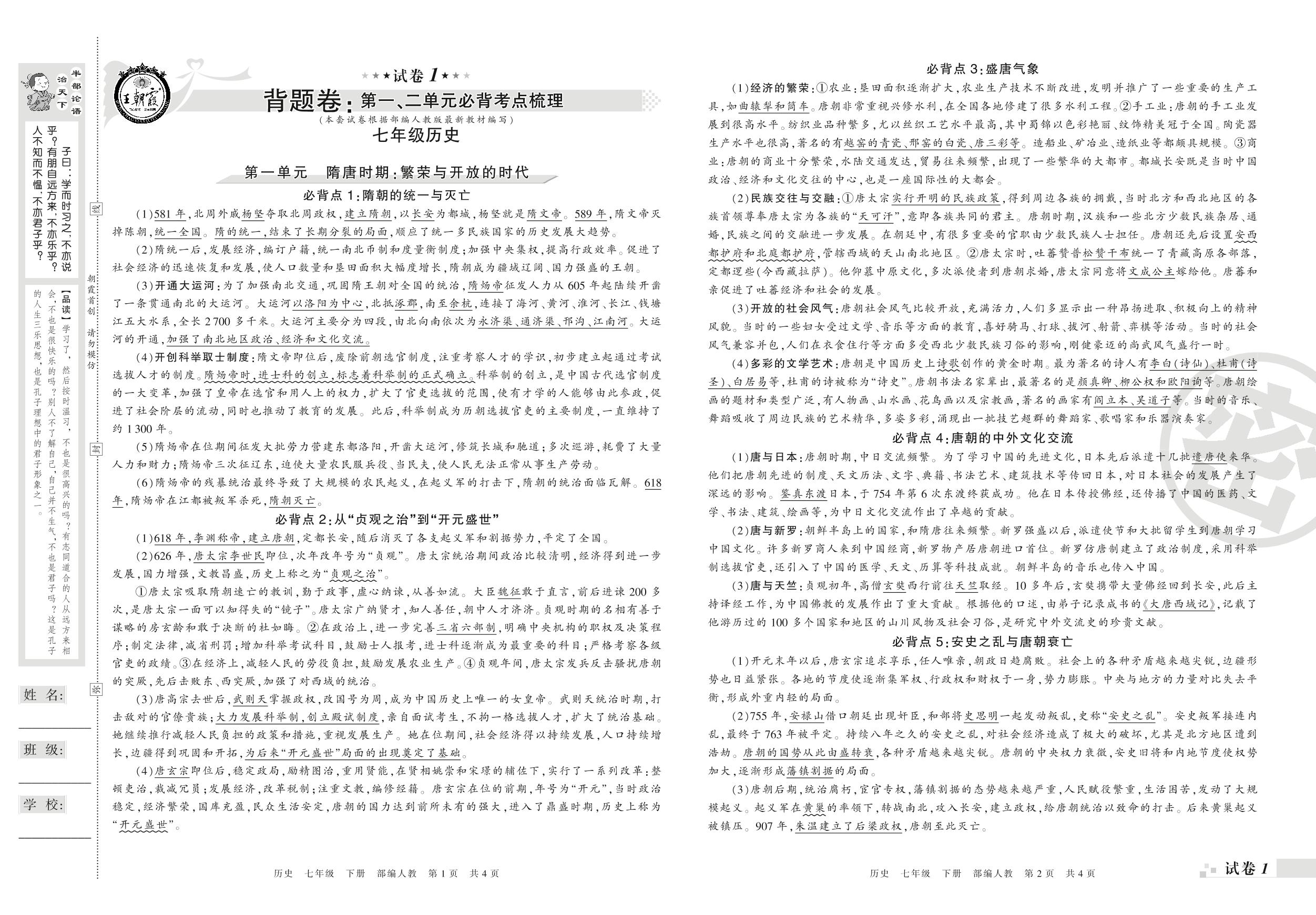 王朝霞期末背题卷——第一、二单元必背考点梳理七年级下册历史(人教版)【1】