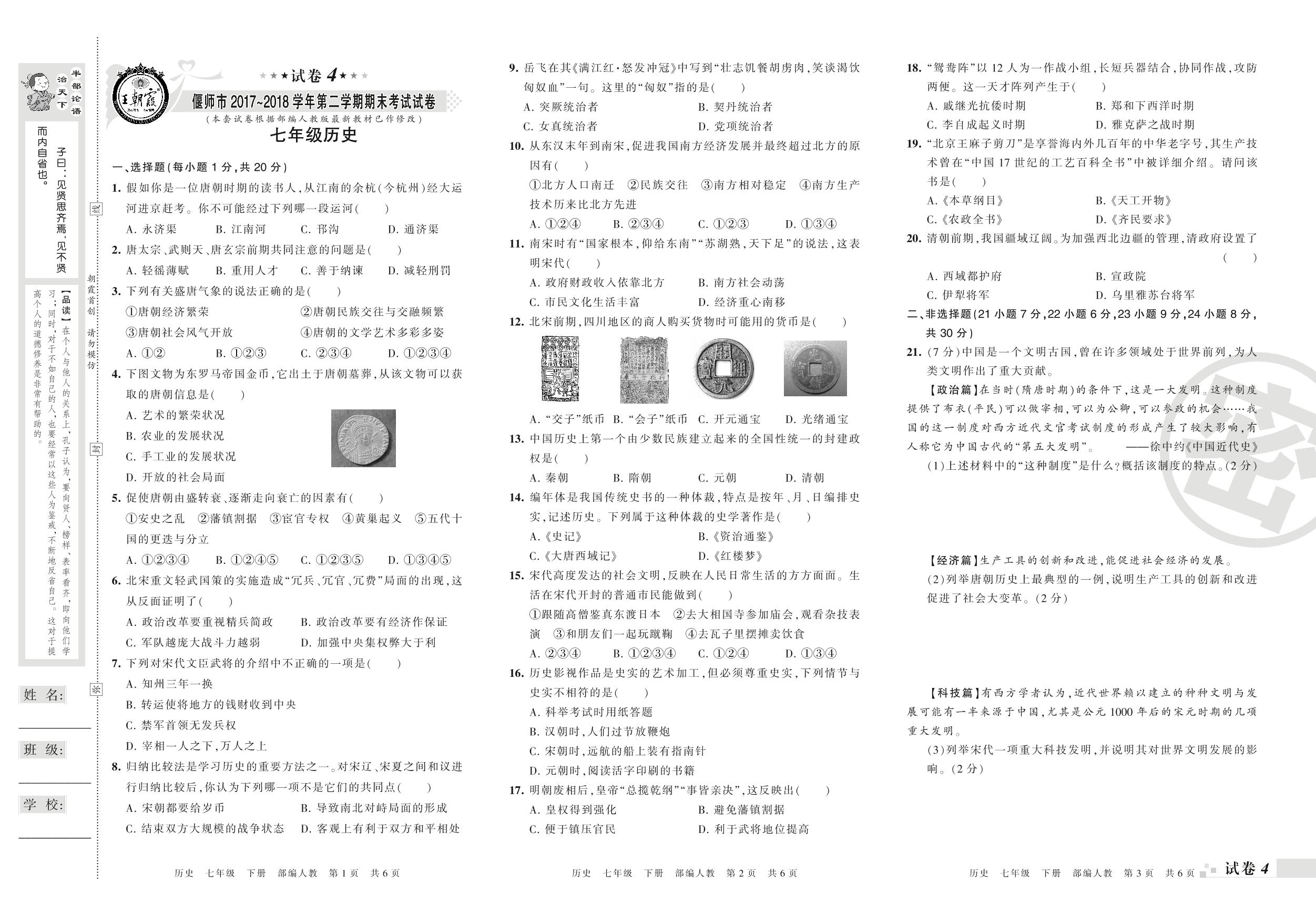 2017-2018学年第二学期偃师市七年级历史试卷(人教版)【4】