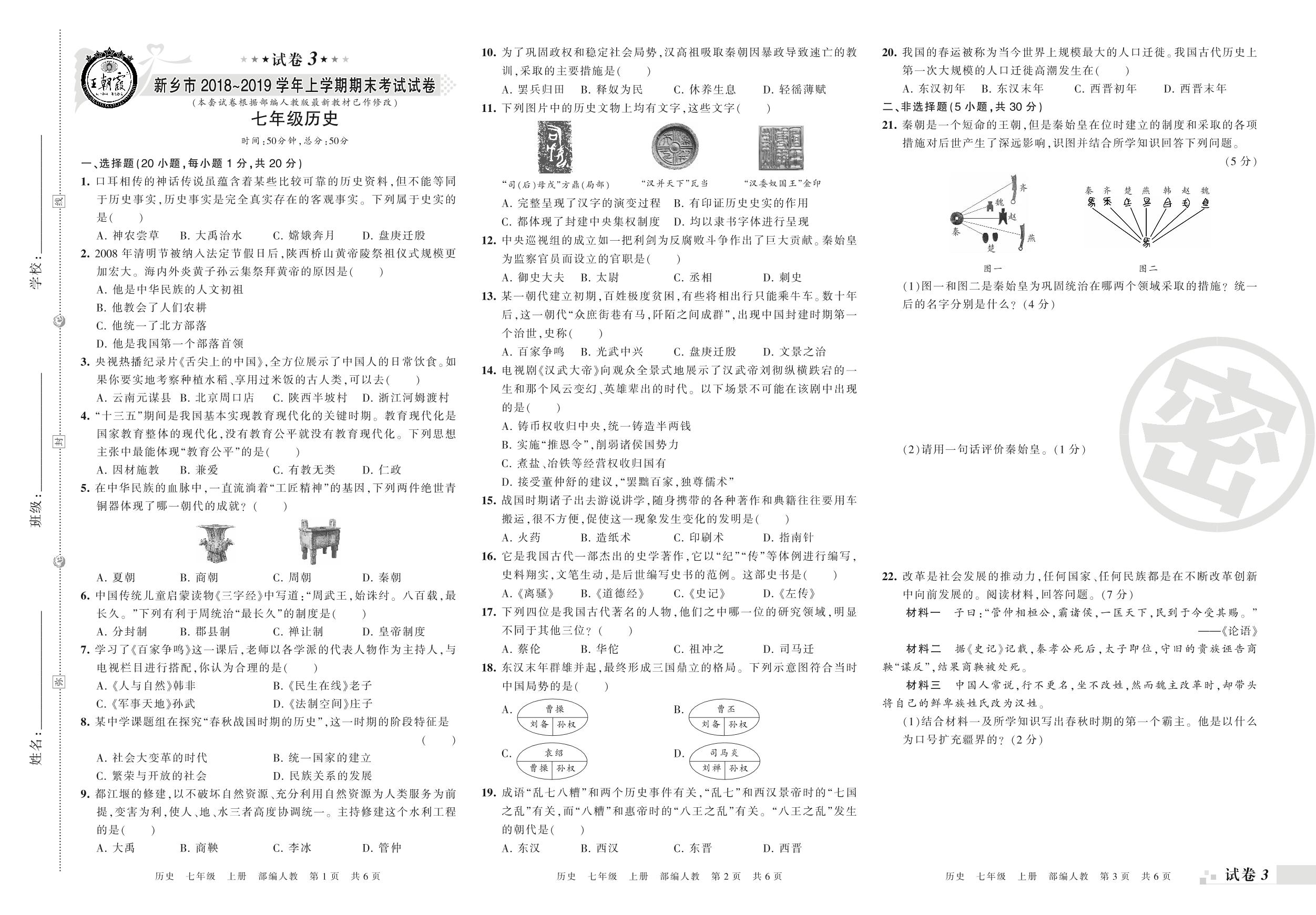 2018-2019学年第一学期新乡市七年级历史试卷(人教版)【3】