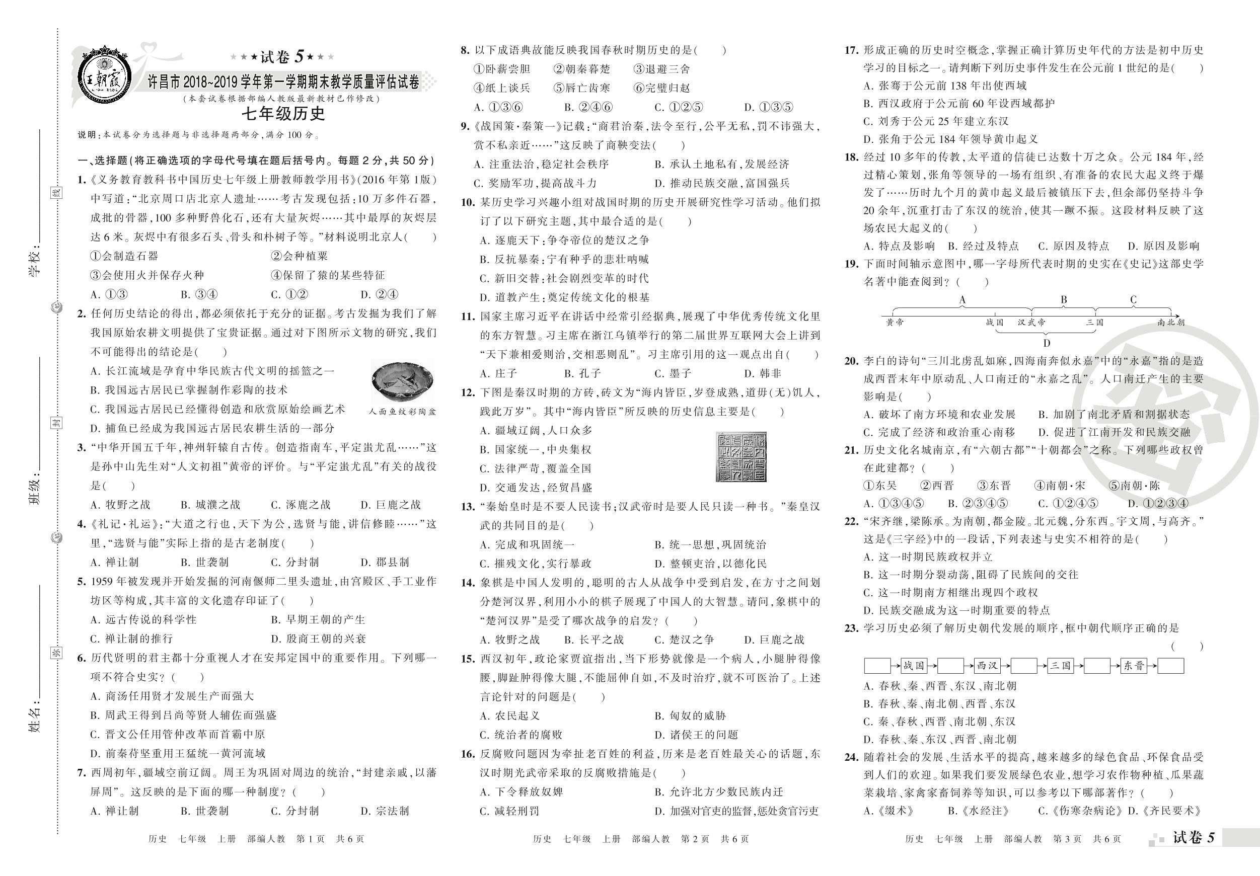 2018-2019学年第一学期许昌市七年级历史试卷(人教版)【5】