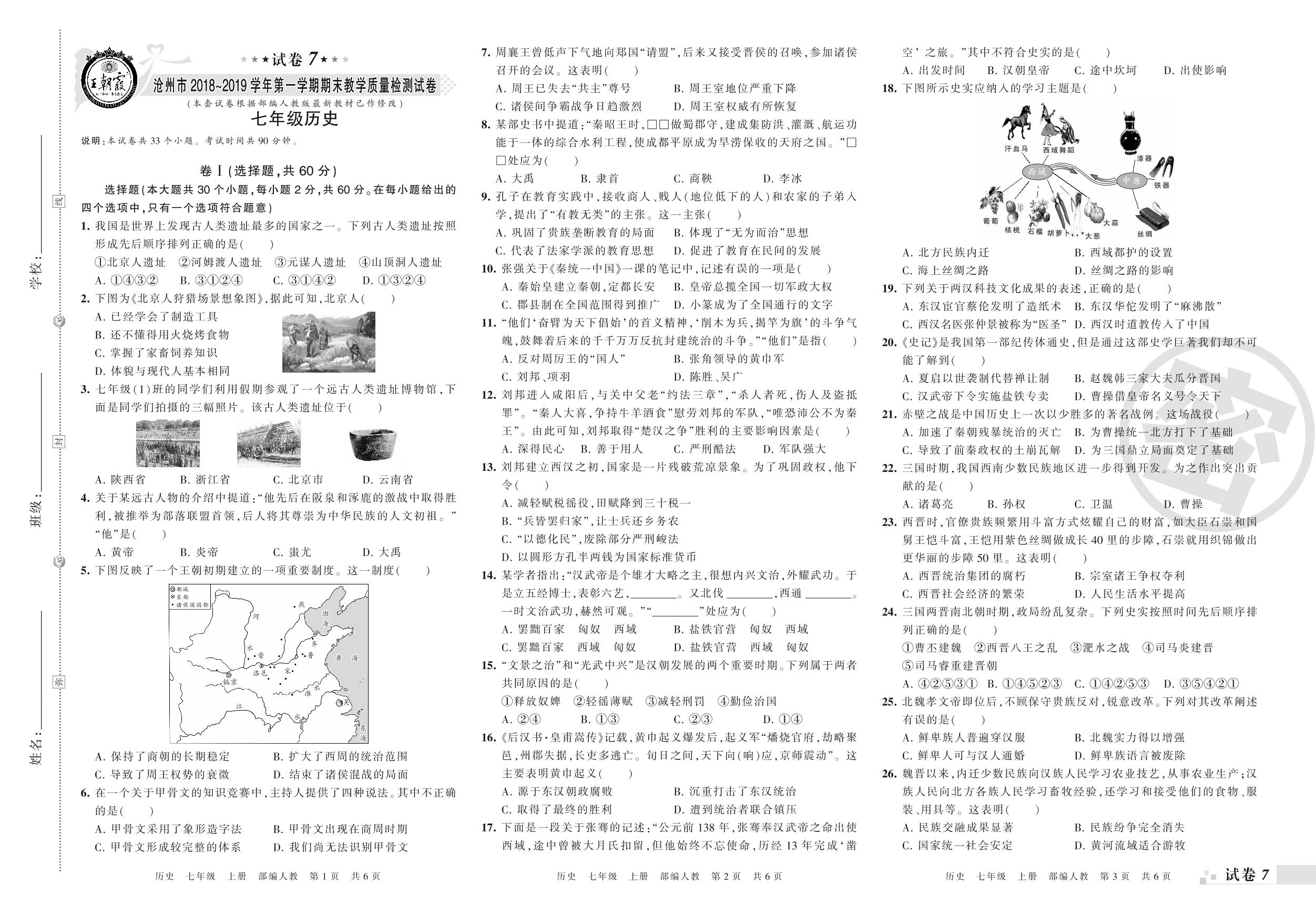2018-2019学年第一学期沧州市七年级历史试卷(人教版)【7】