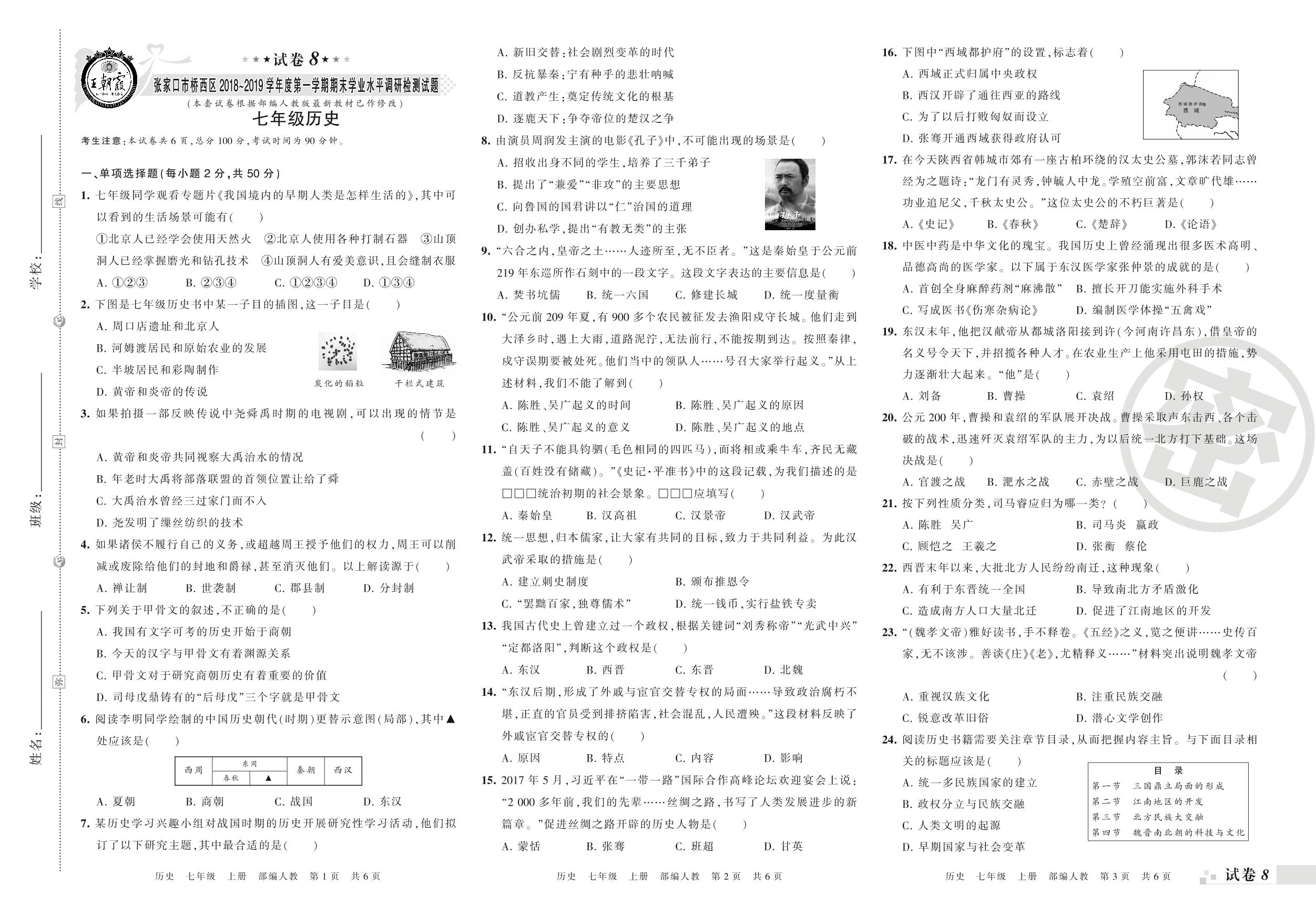 2018-2019学年第一学期张家口市桥西区七年级历史试卷(人教版)【8】