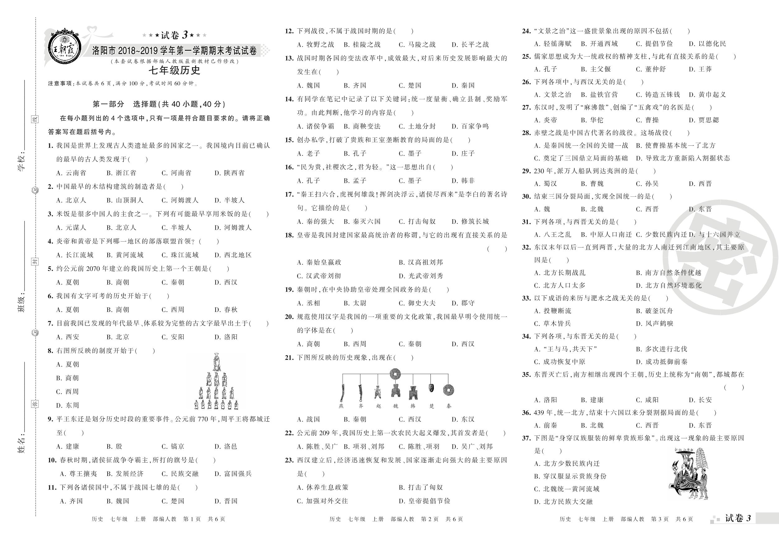 2018-2019学年第一学期洛阳市七年级历史试卷(人教版)【3】