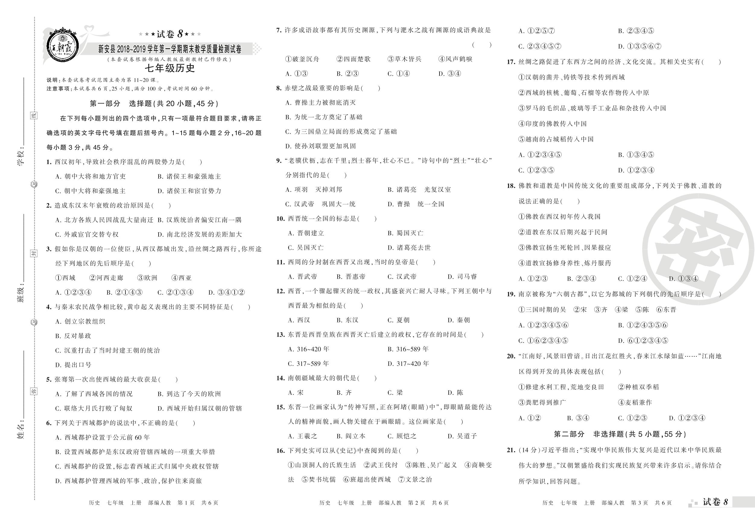 2018-2019学年第一学期洛阳市新安县七年级历史试卷(人教版)【8】