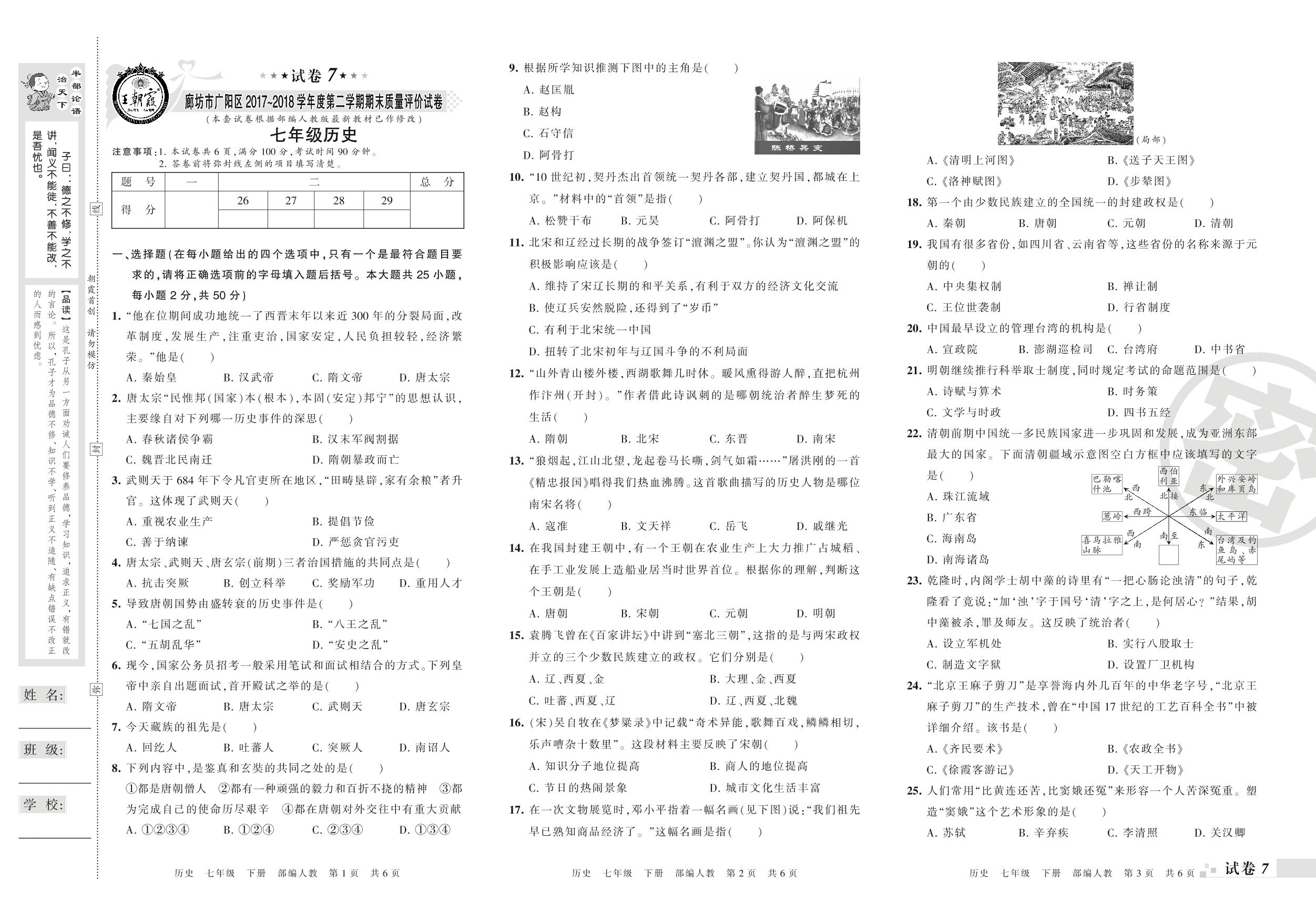 2017-2018学年第二学期廊坊市广阳区七年级历史试卷(人教版)【7】