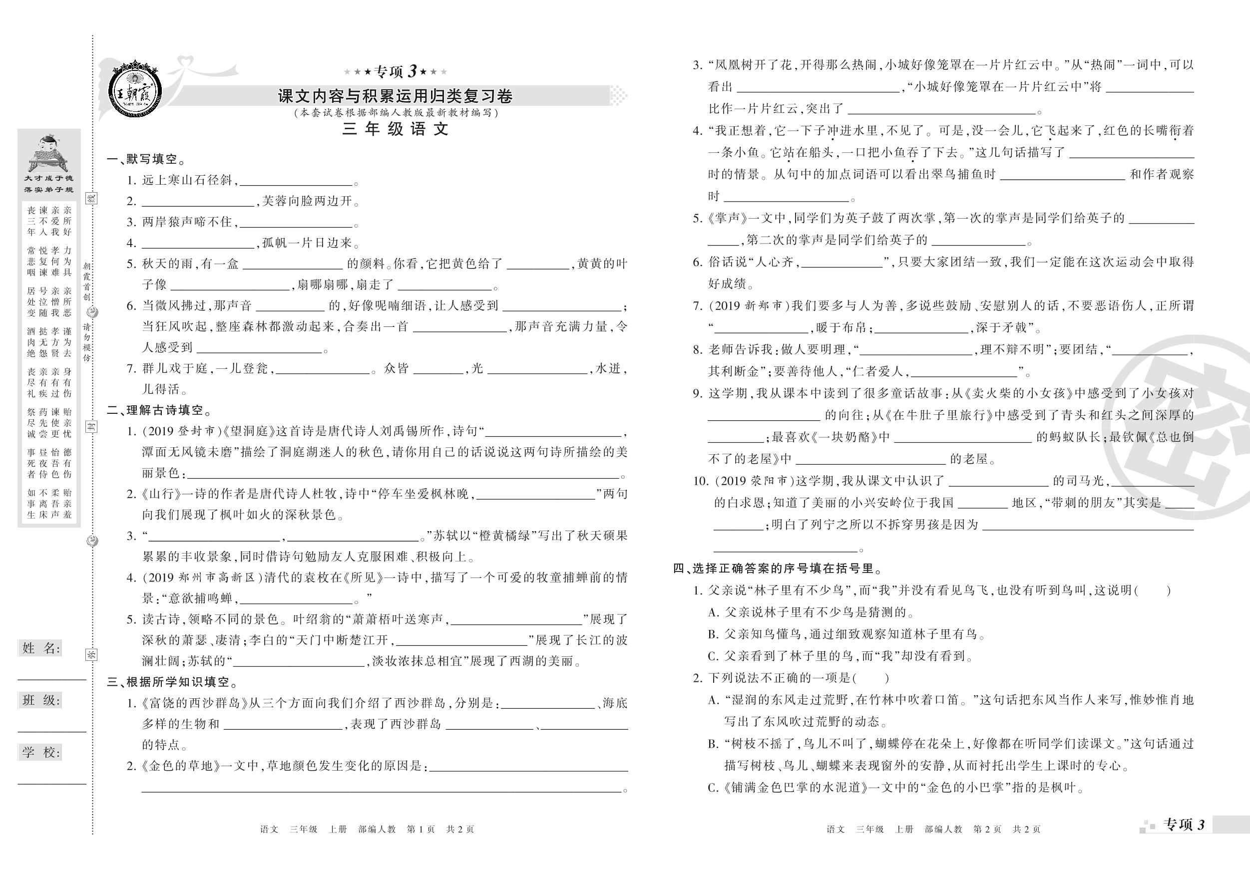 王朝霞期末专项卷——课文内容与积累运用、课内阅读与写作真题归类复习卷三年级上册语文(人教版)_R21080192250【0】
