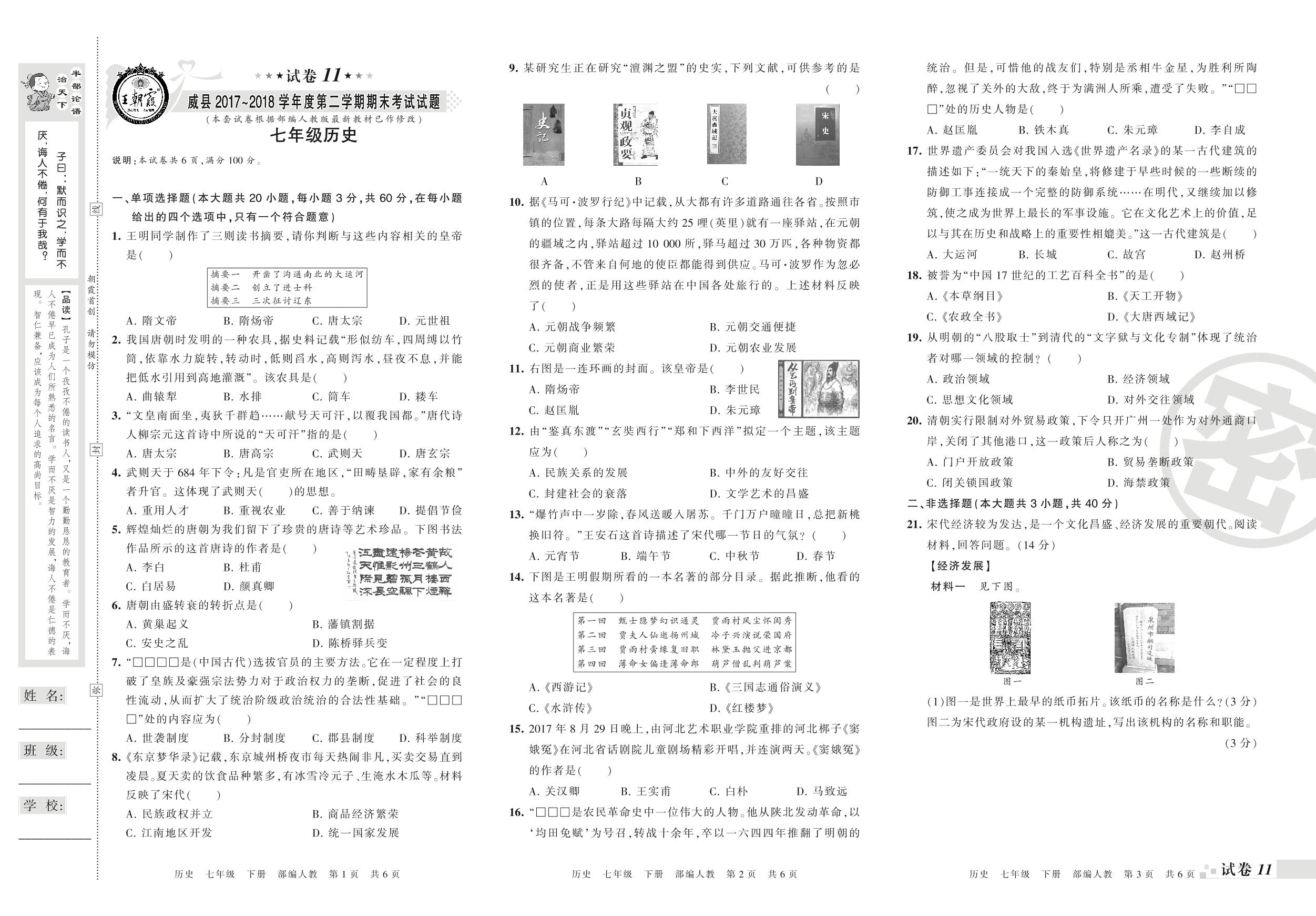 七年级历史人教版下册期末卷