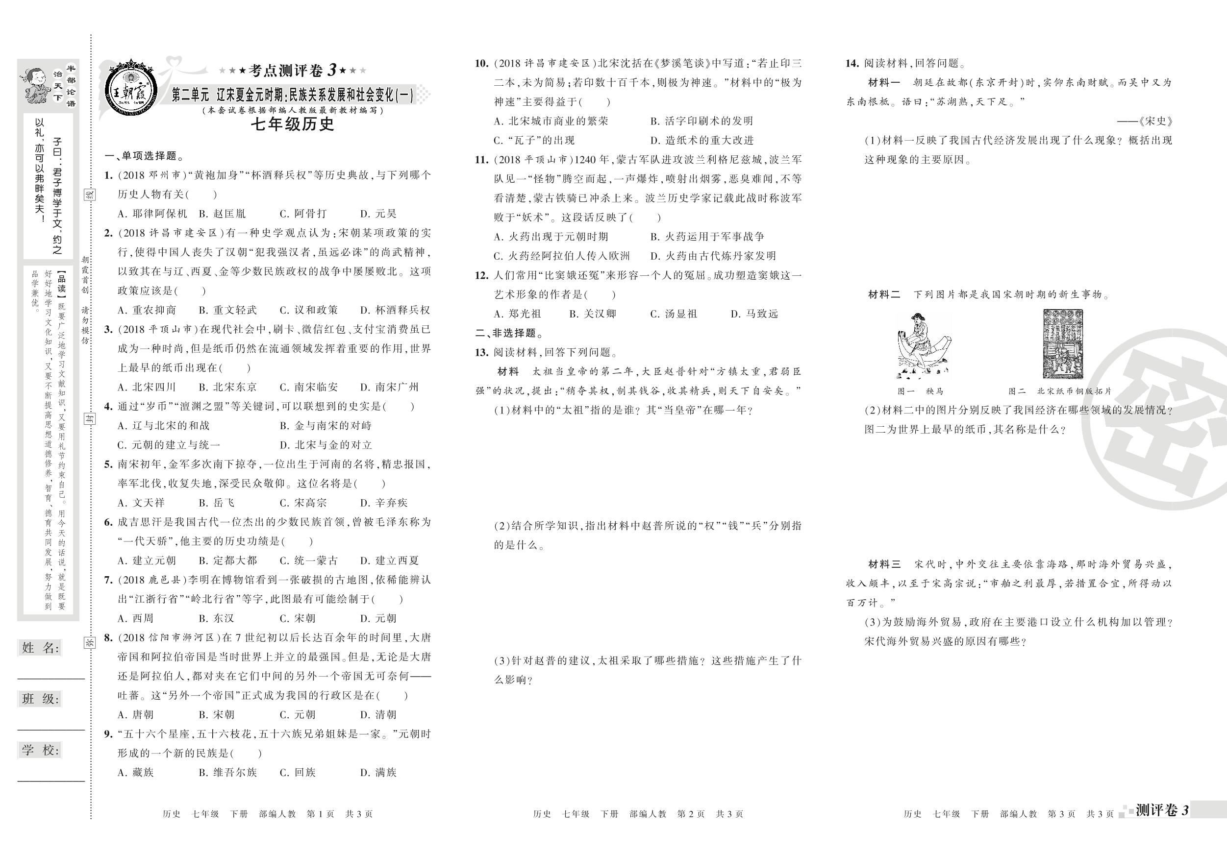 王朝霞期末测评卷——第二单元 辽宋夏金元时期:民族关系发展和社会变化(一)、第二单元 辽宋夏金元时期:民族关系发展和社会变化(二)七年级下册历史(人教版)【0】