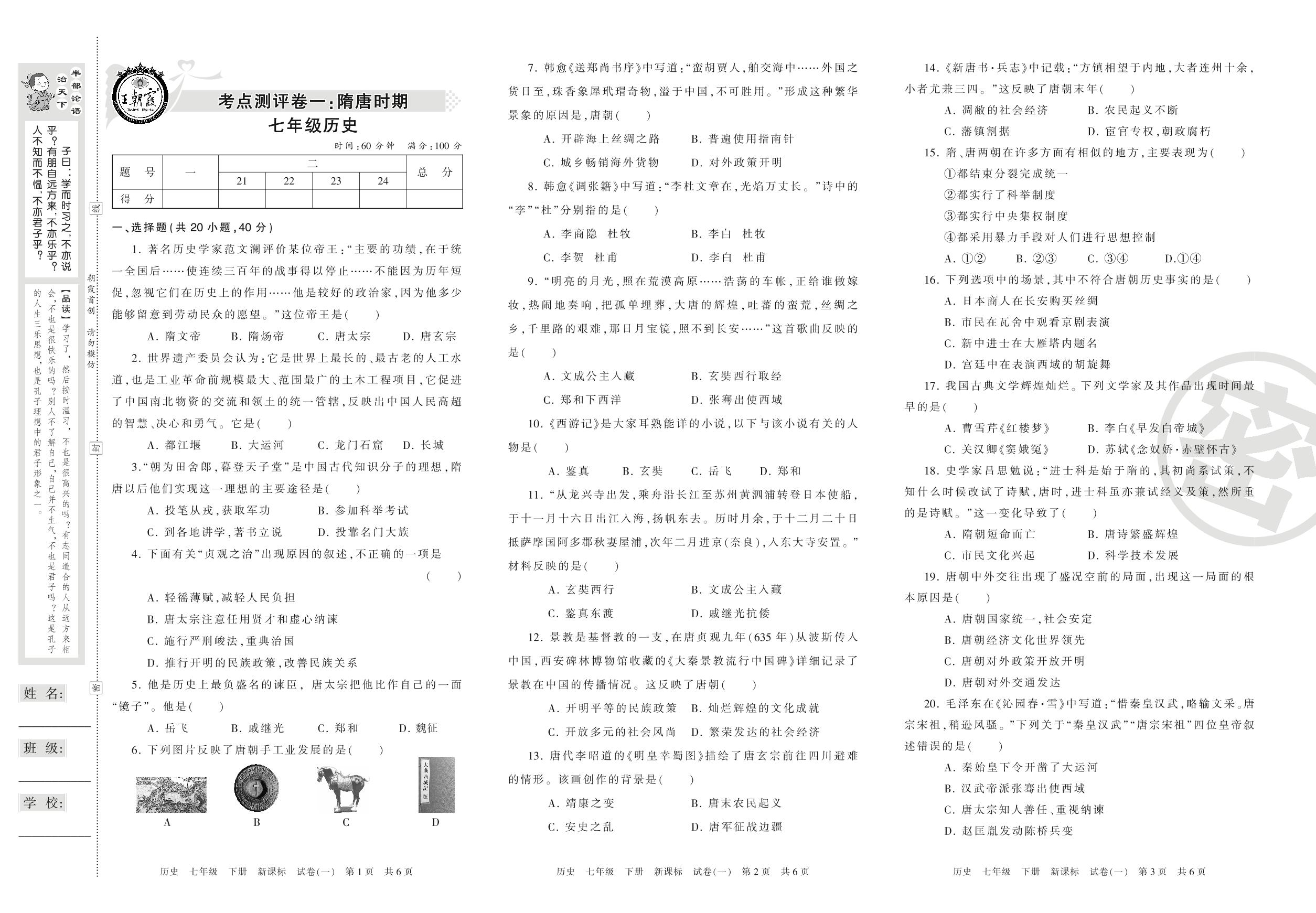 王朝霞期末测评卷七年级下册历史(新课版)【1】