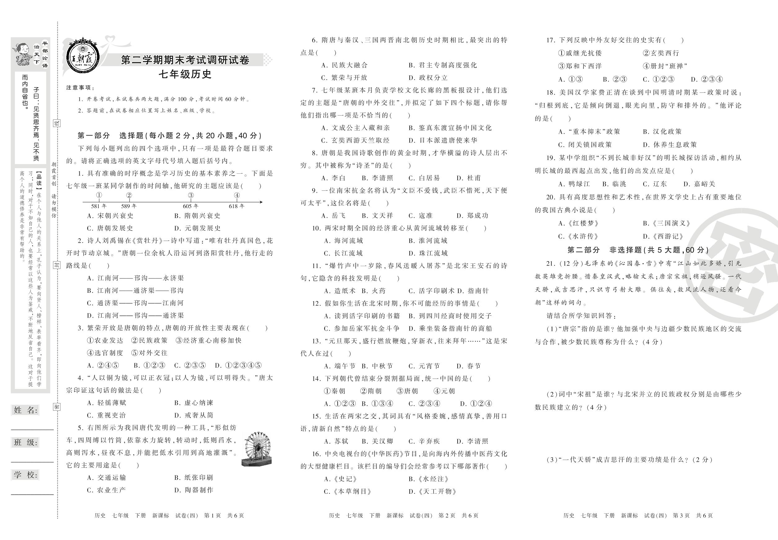 王朝霞期末调研卷七年级下册历史(新课版)【4】