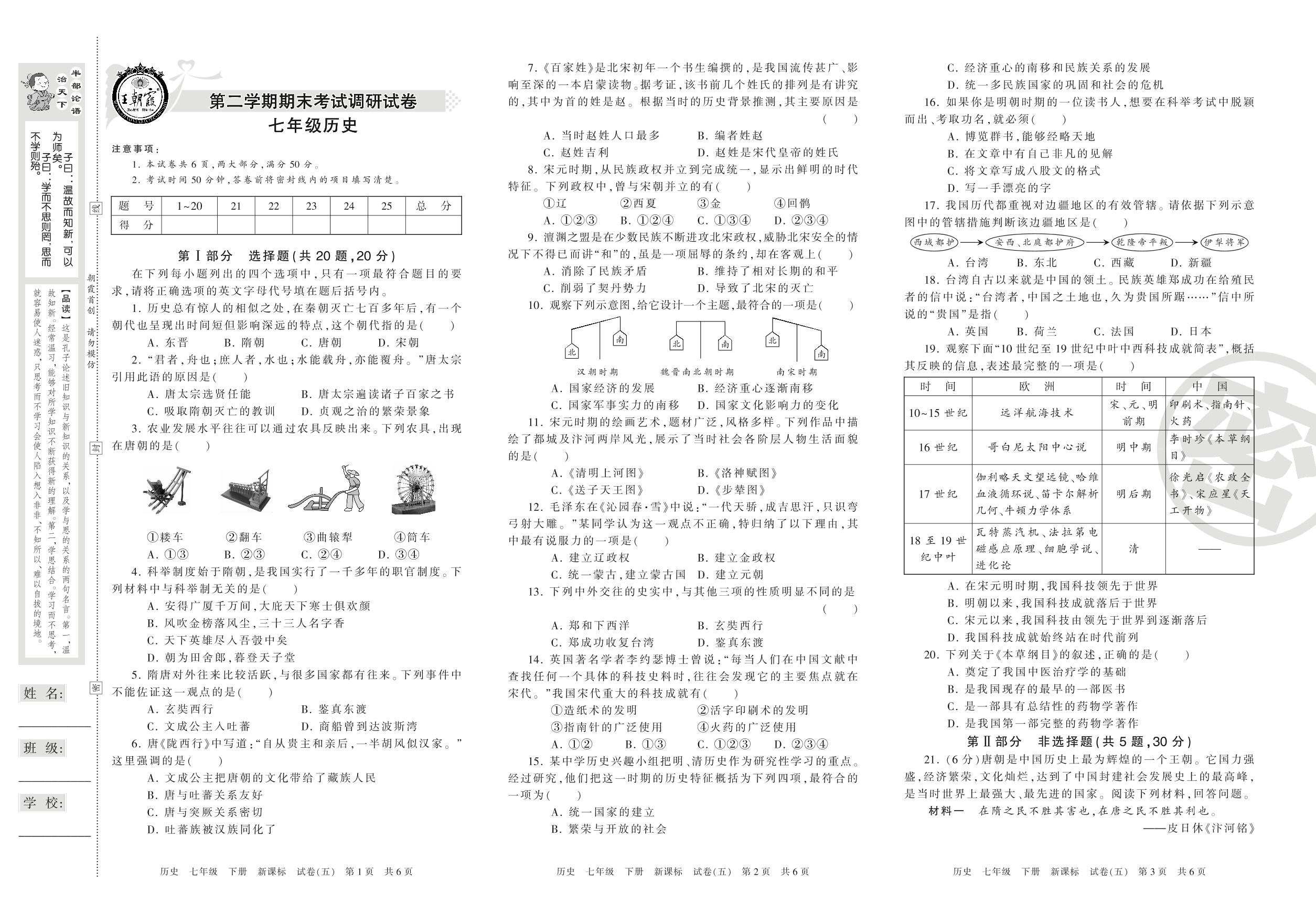 王朝霞期末调研卷七年级下册历史(新课版)【5】