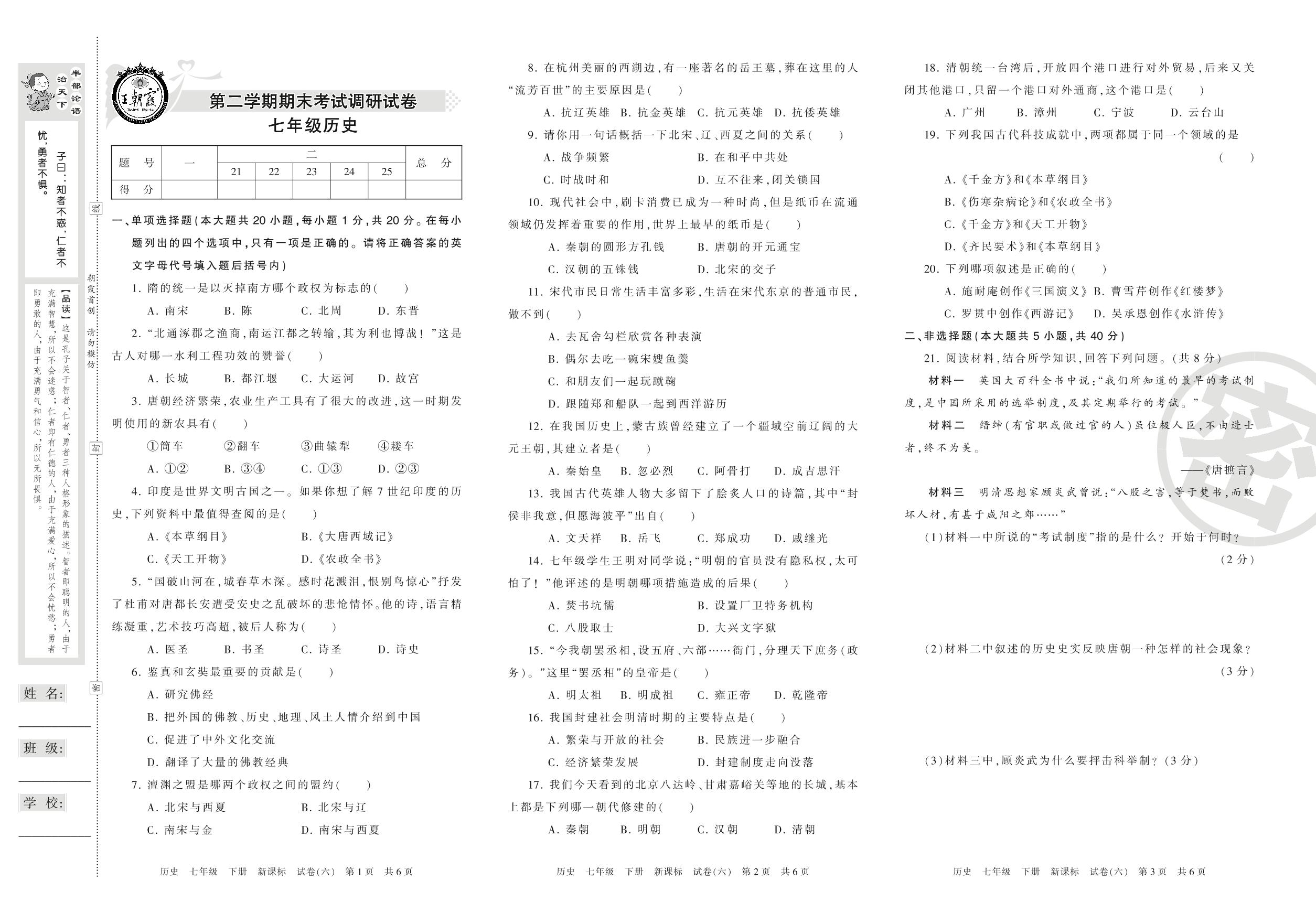 王朝霞期末调研卷七年级下册历史(新课版)【6】