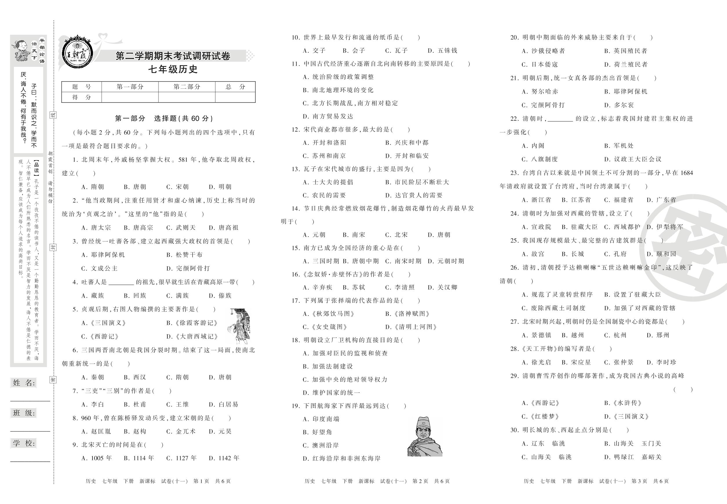 王朝霞期末调研卷七年级下册历史(新课版)【11】