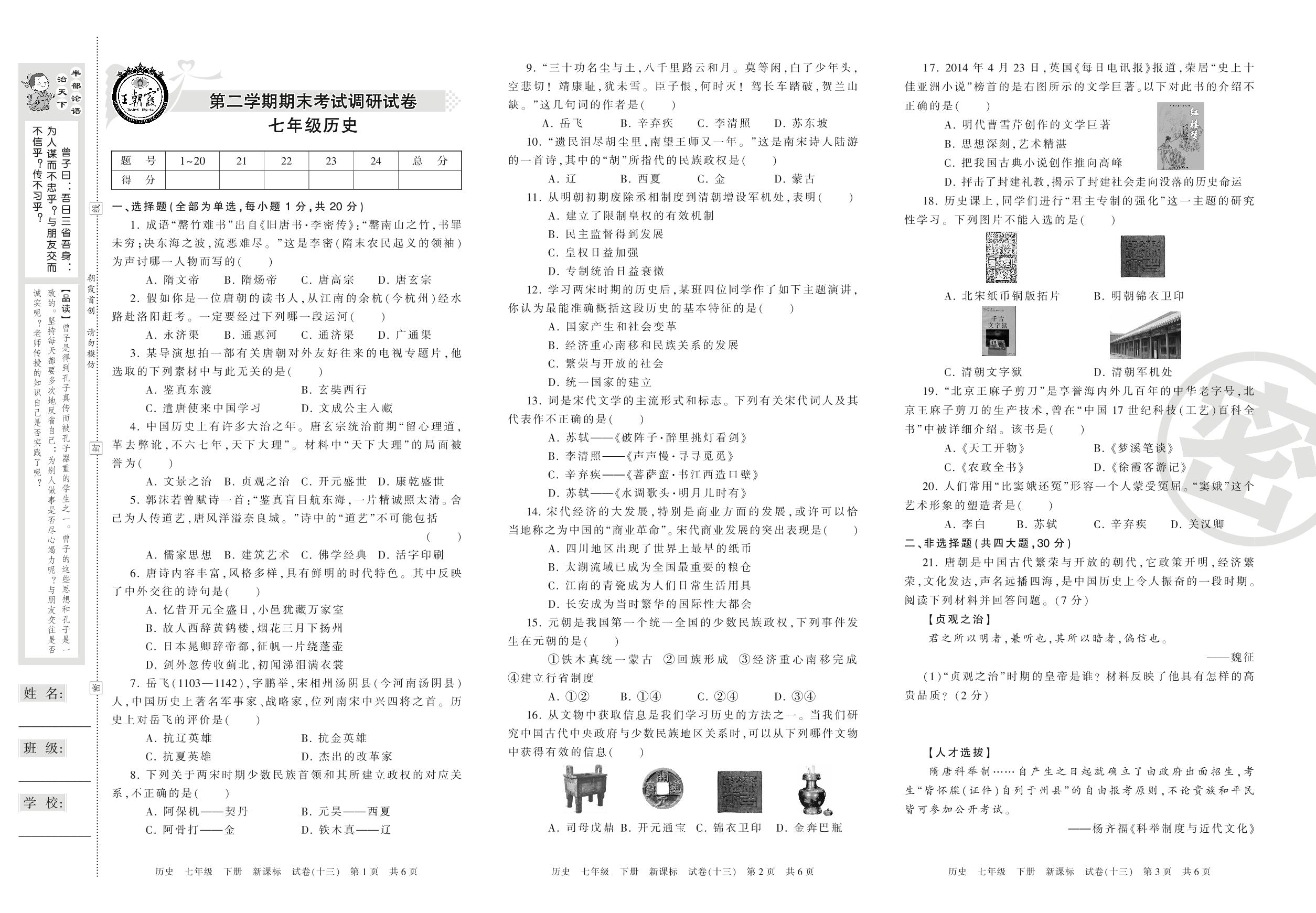 王朝霞期末调研卷七年级下册历史(新课版)【13】