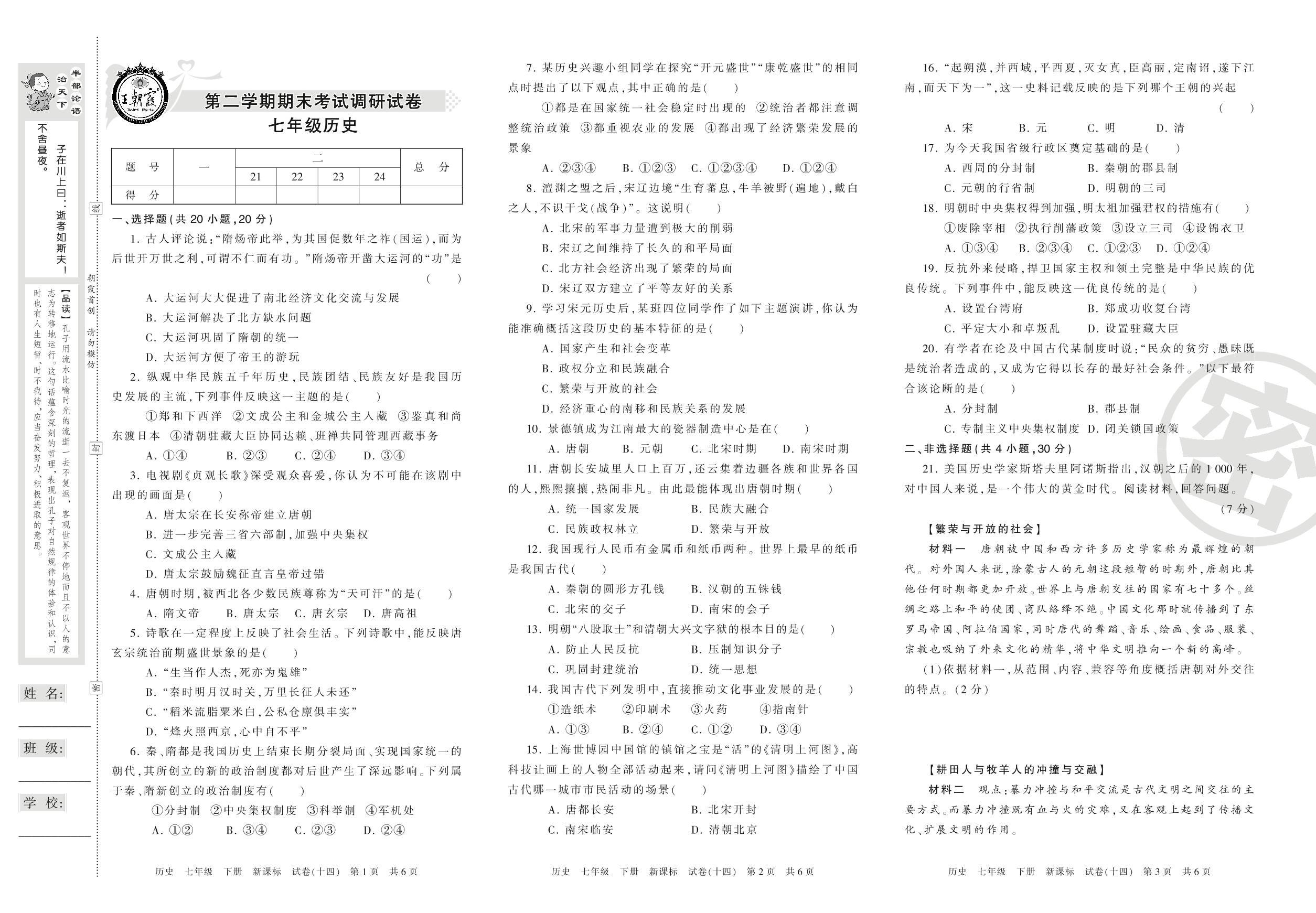 王朝霞期末调研卷七年级下册历史(新课版)【14】