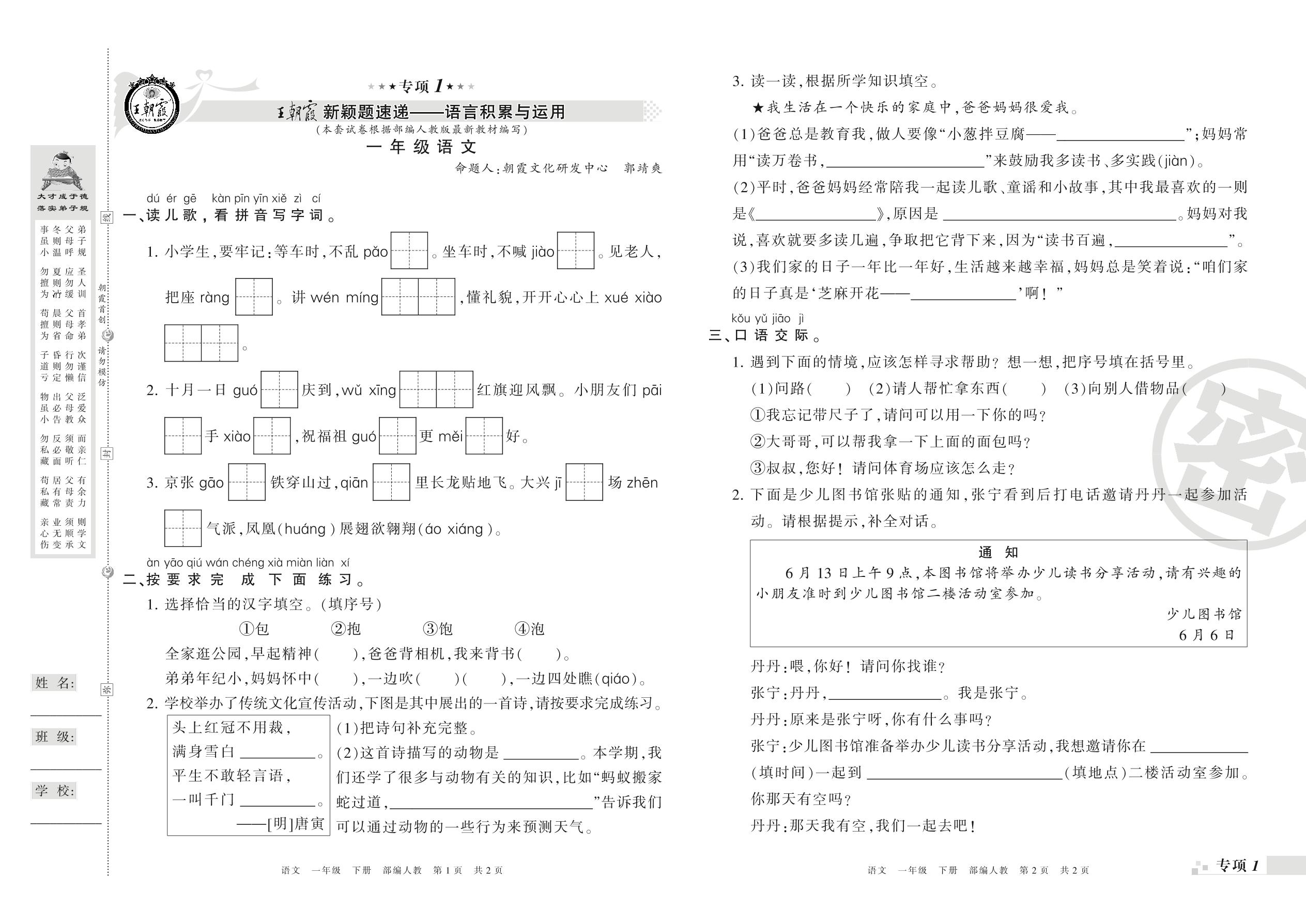 王朝霞期末专项卷——新颖题速递:语言积累与运用、非连续性文本阅读一年级下册语文(人教版)_R210731175718【0】