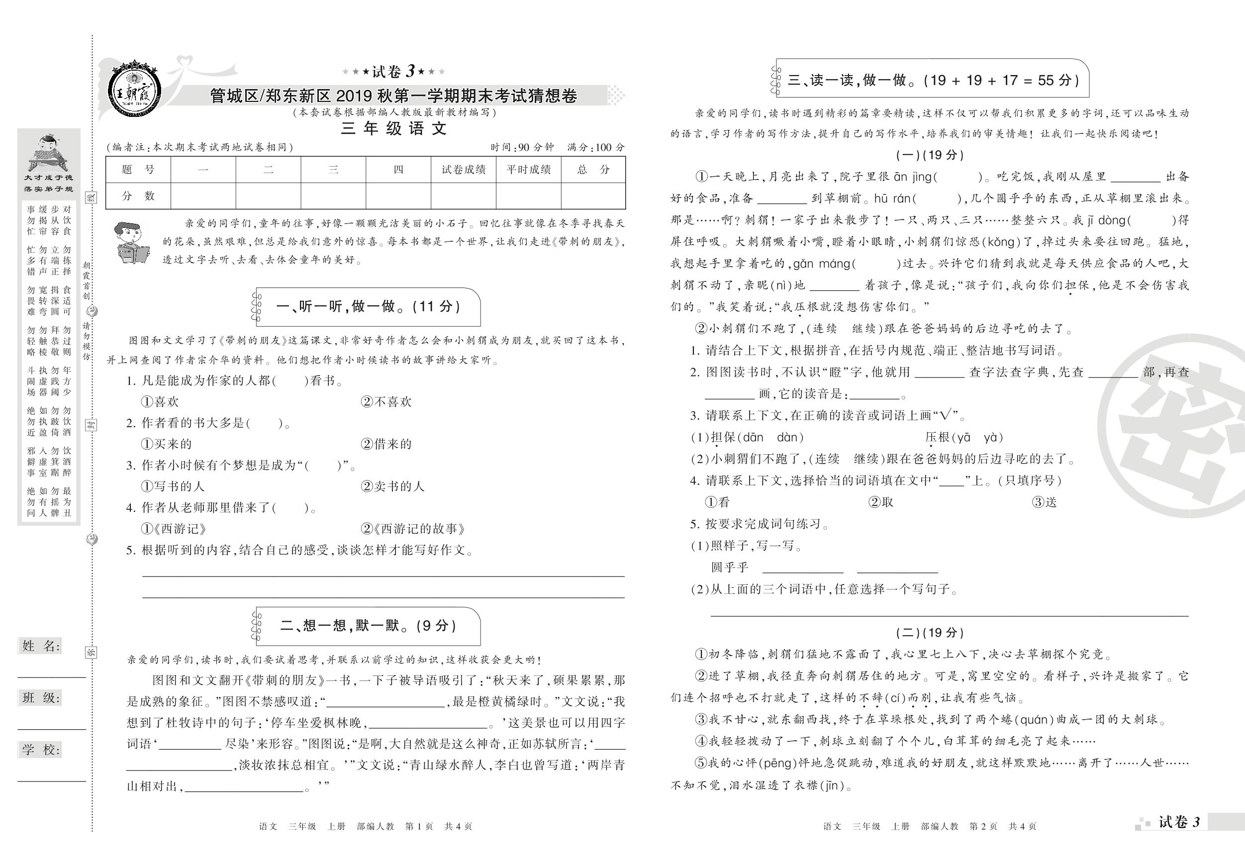 2018-2019学年第一学期郑州市管城区、郑东新区猜想卷三年级语文试卷(人教版)【3】