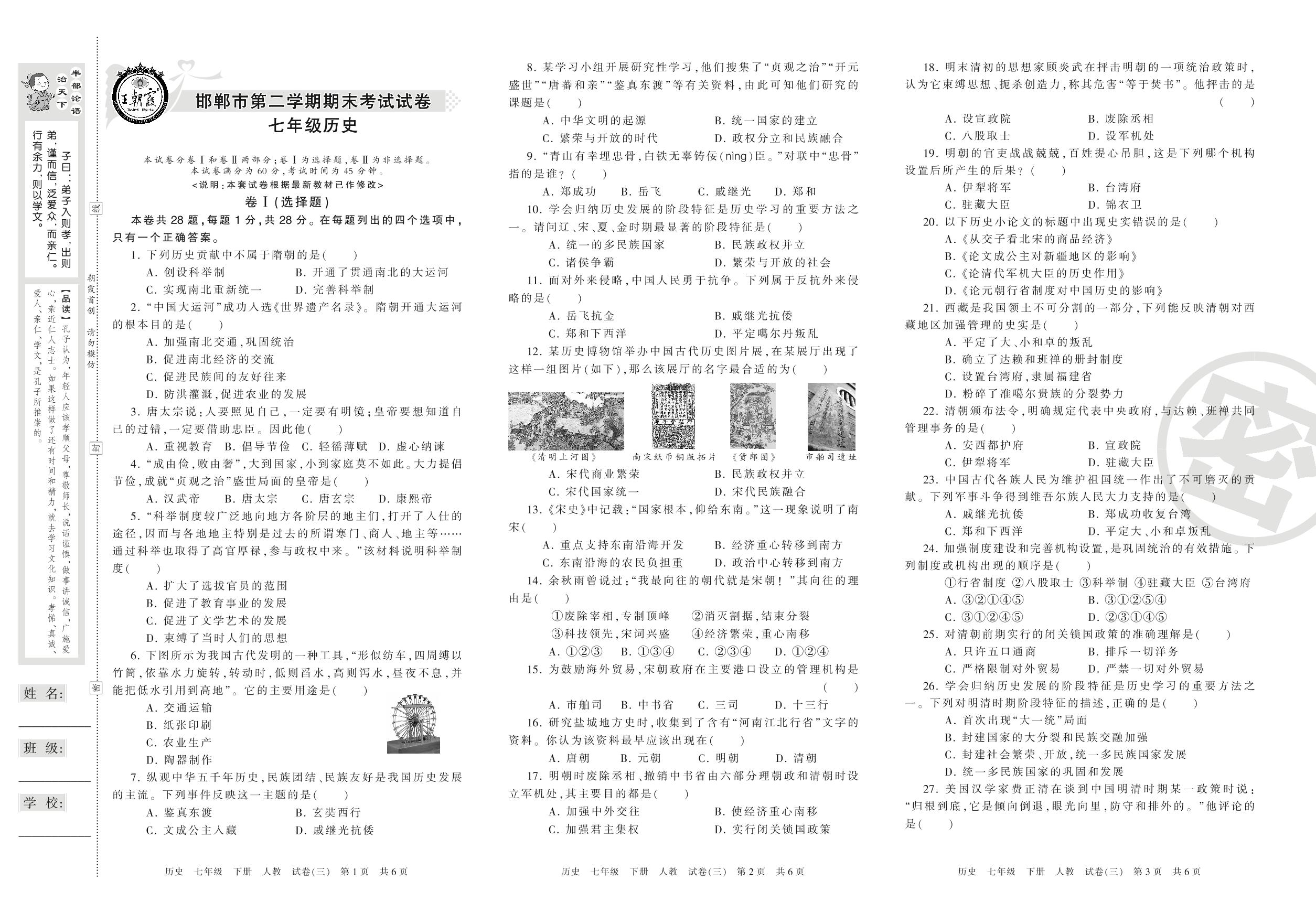 2015-2016学年第二学期邯郸市七年级历史试卷(人教版)【3】