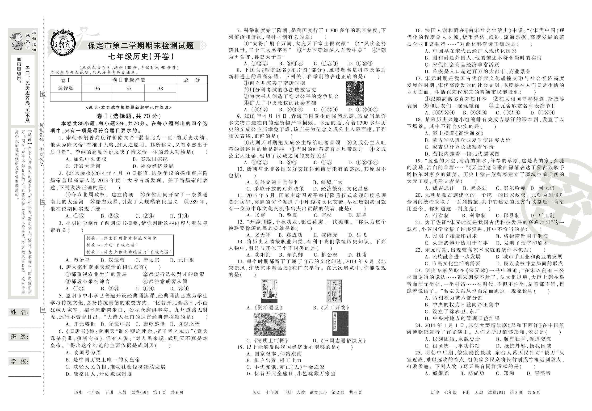 2015-2016学年第二学期保定市七年级历史试卷(人教版)【4】