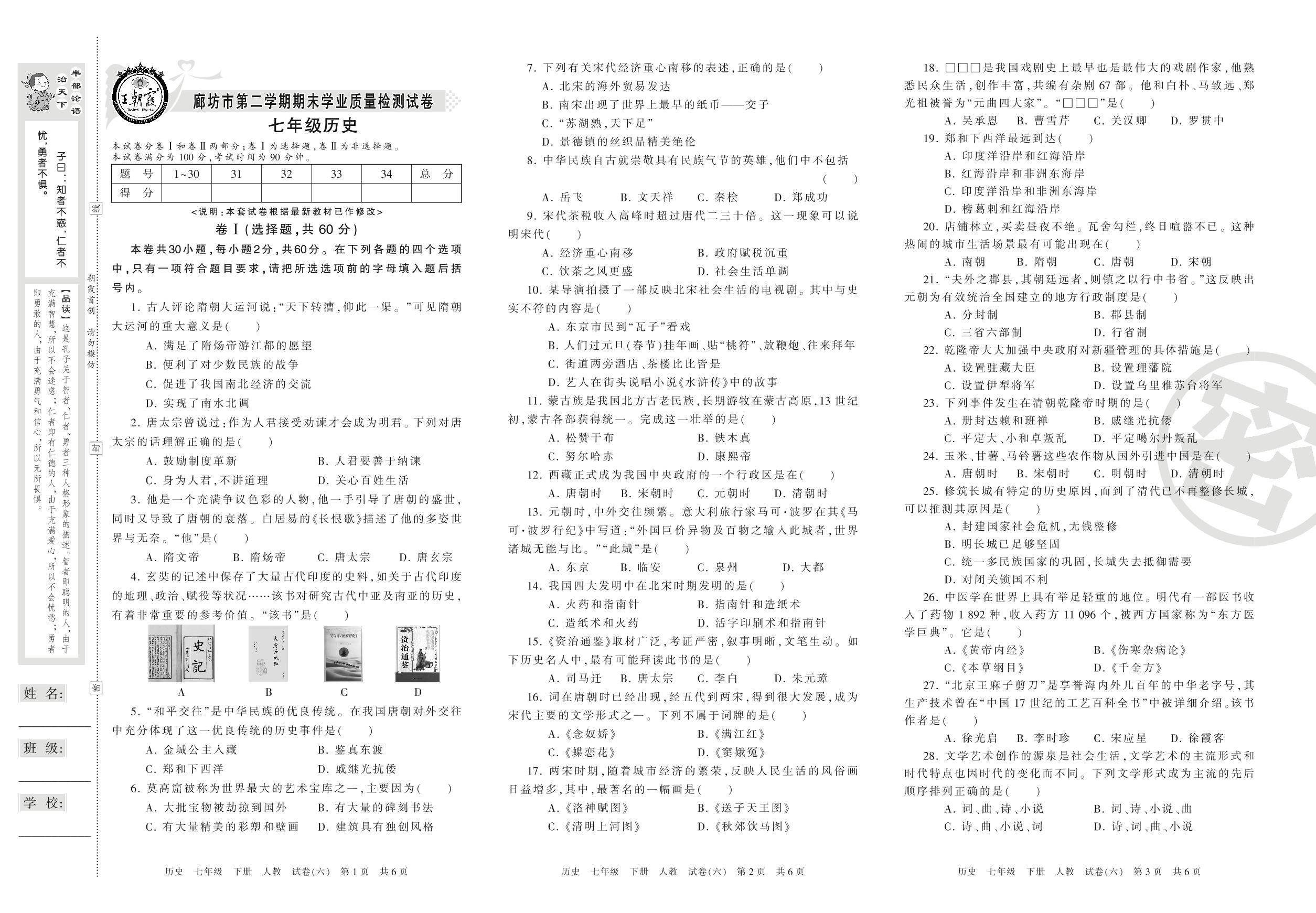 2015-2016学年第二学期廊坊市七年级历史试卷(人教版)【6】