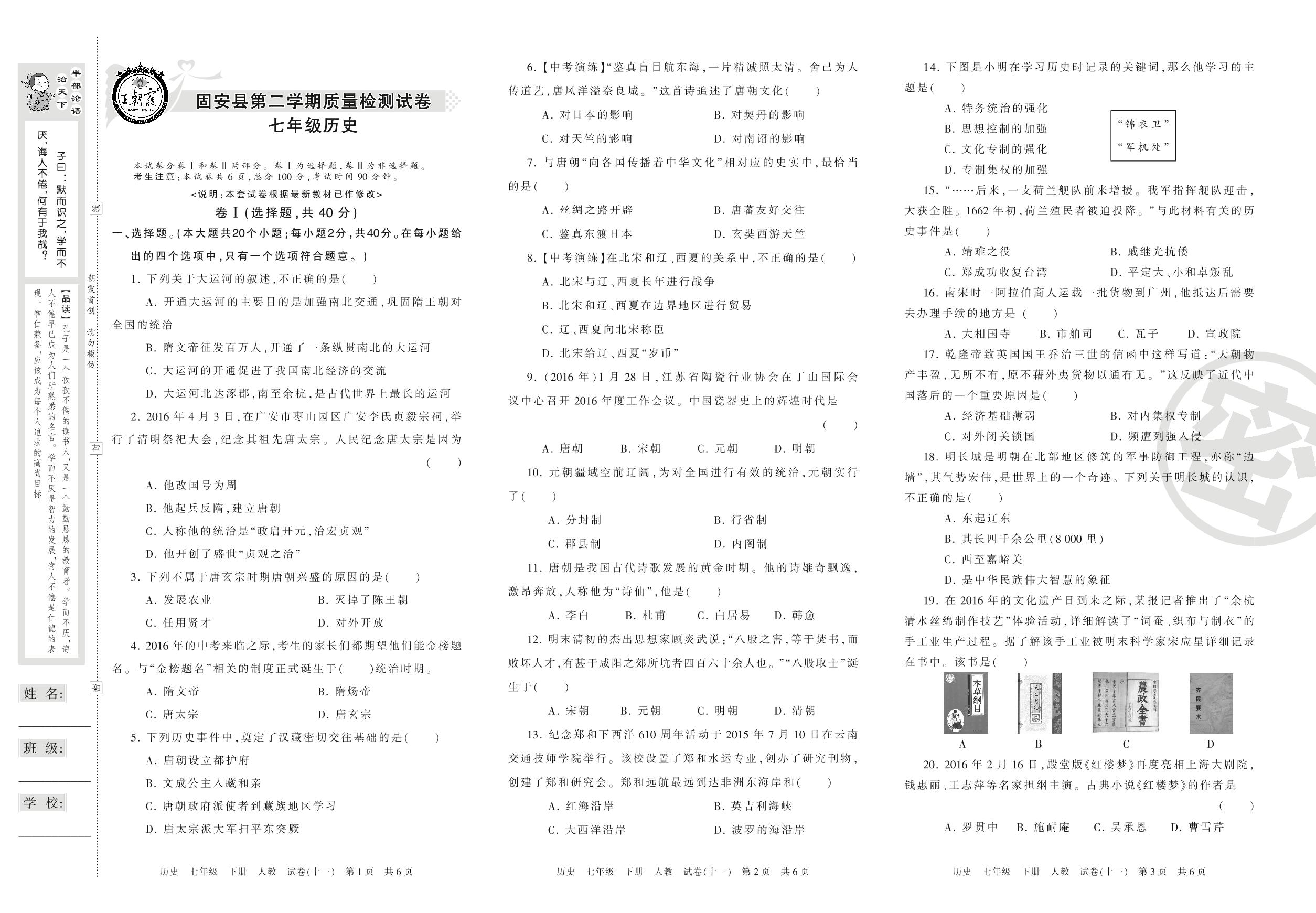2015-2016学年第二学期廊坊市固安县七年级历史试卷(人教版)【11】