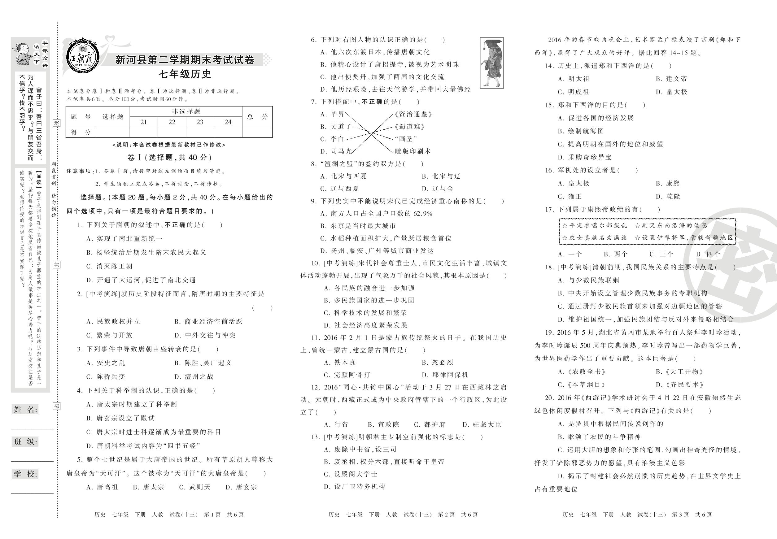 2015-2016学年第二学期邢台市新河县七年级历史试卷(人教版)【13】