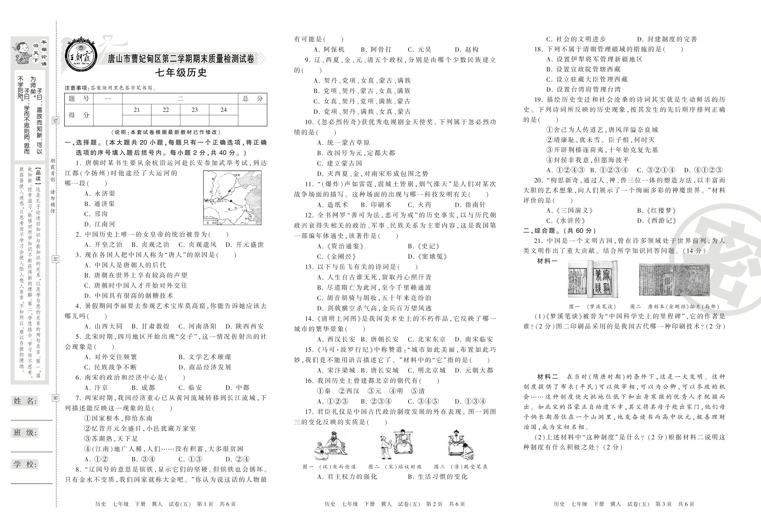 七年级历史冀人版下册期末卷