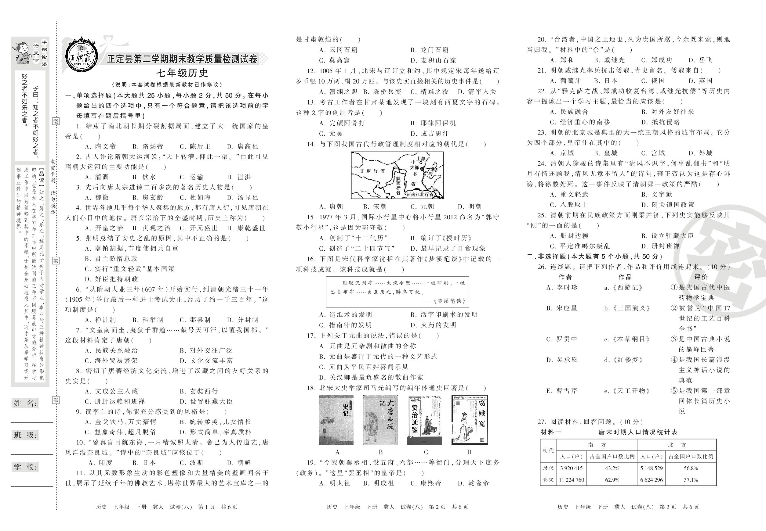 2015-2016学年第二学期石家庄市正定县七年级历史试卷(冀人版)【8】