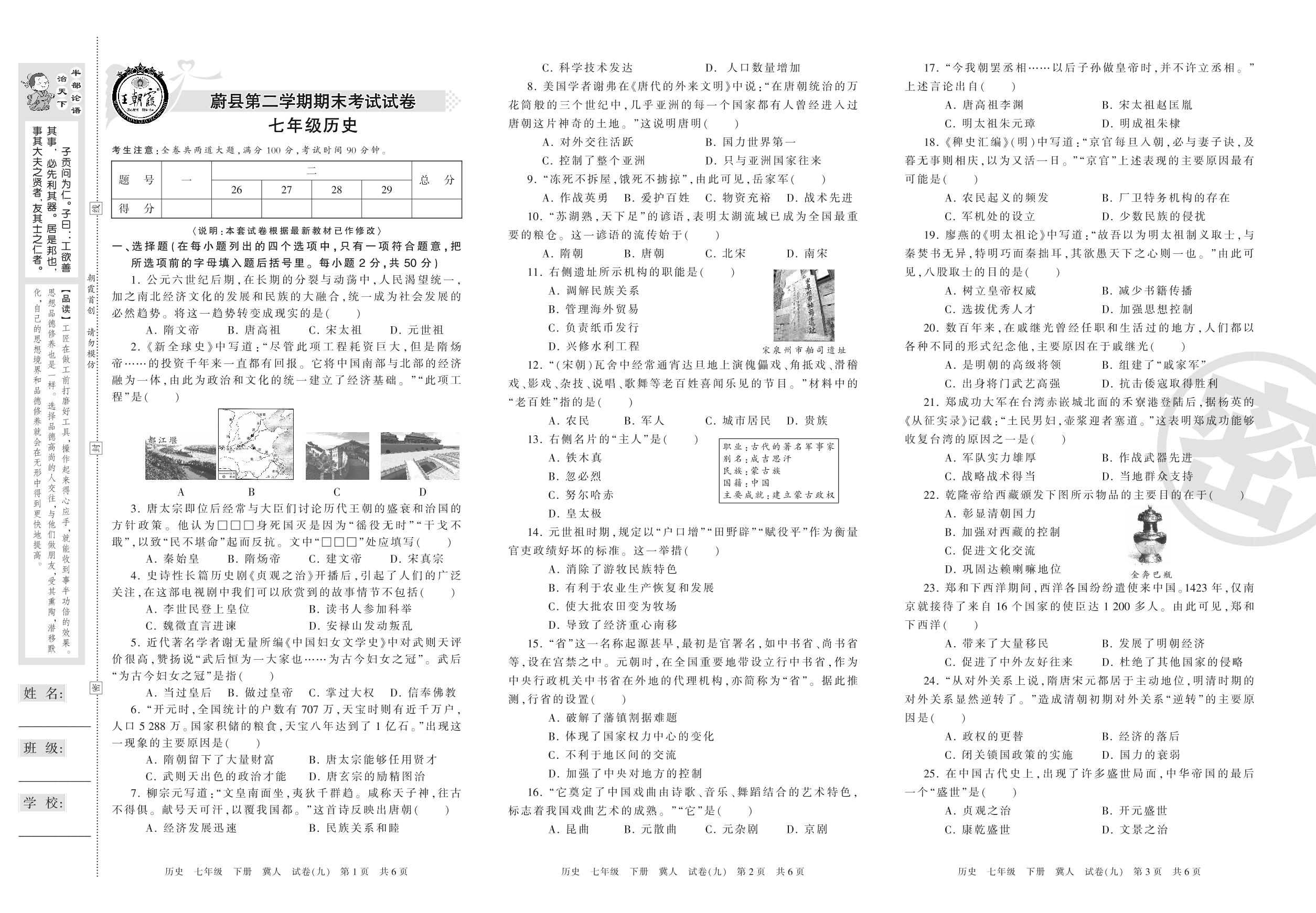 2015-2016学年第二学期张家口市蔚县七年级历史试卷(冀人版)【9】