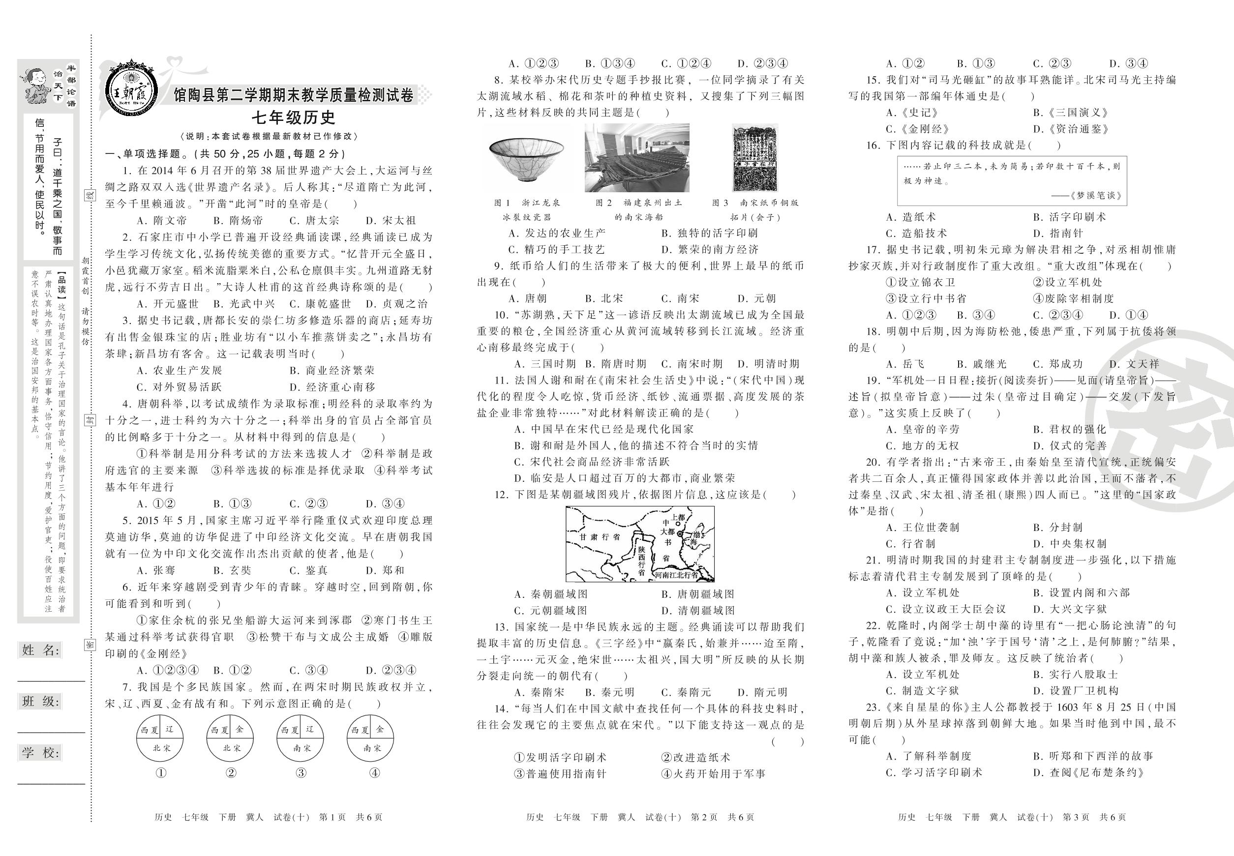 2015-2016学年第二学期邯郸市馆陶县七年级历史试卷(冀人版)【10】