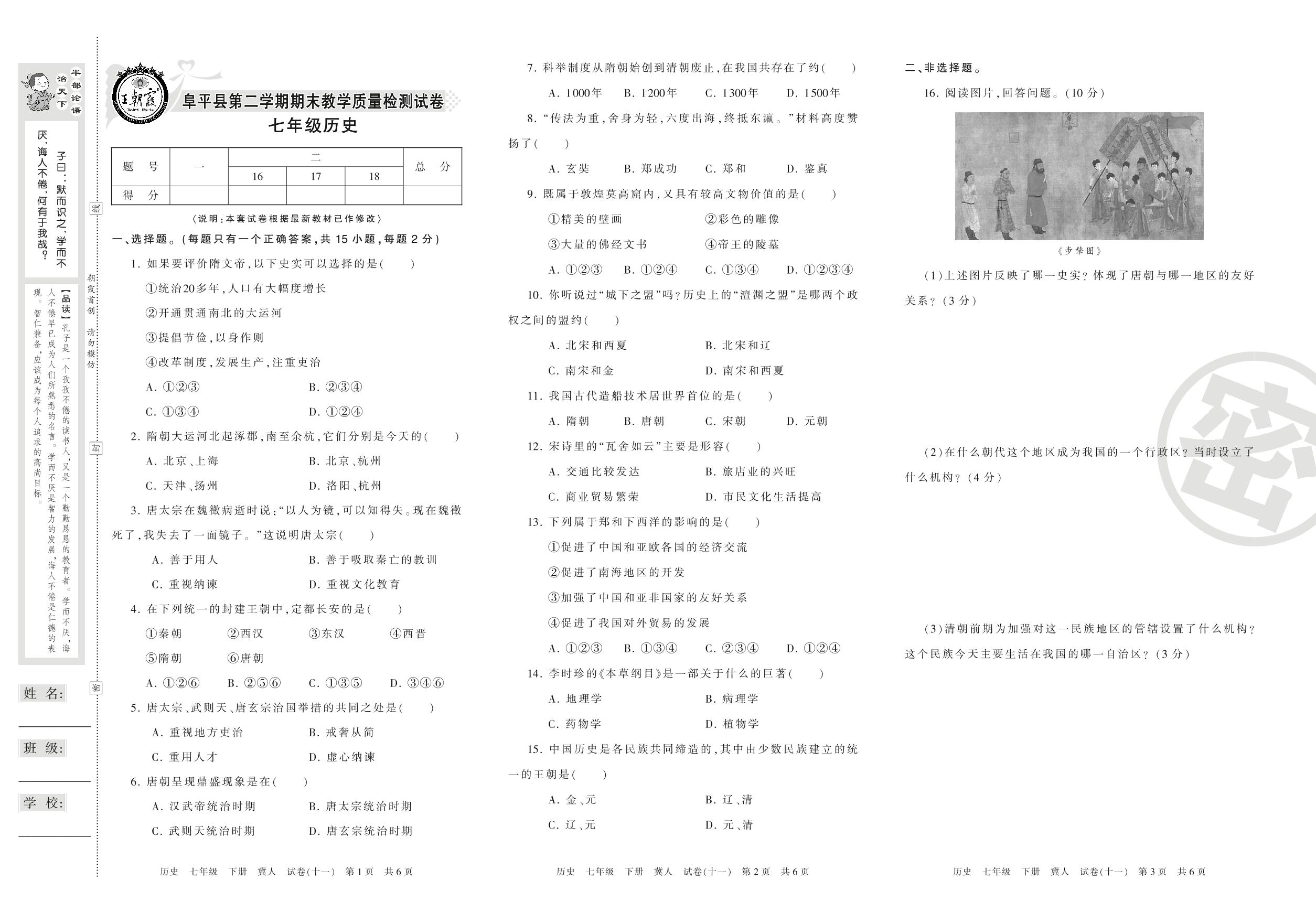 七年级历史冀人版下册期末卷