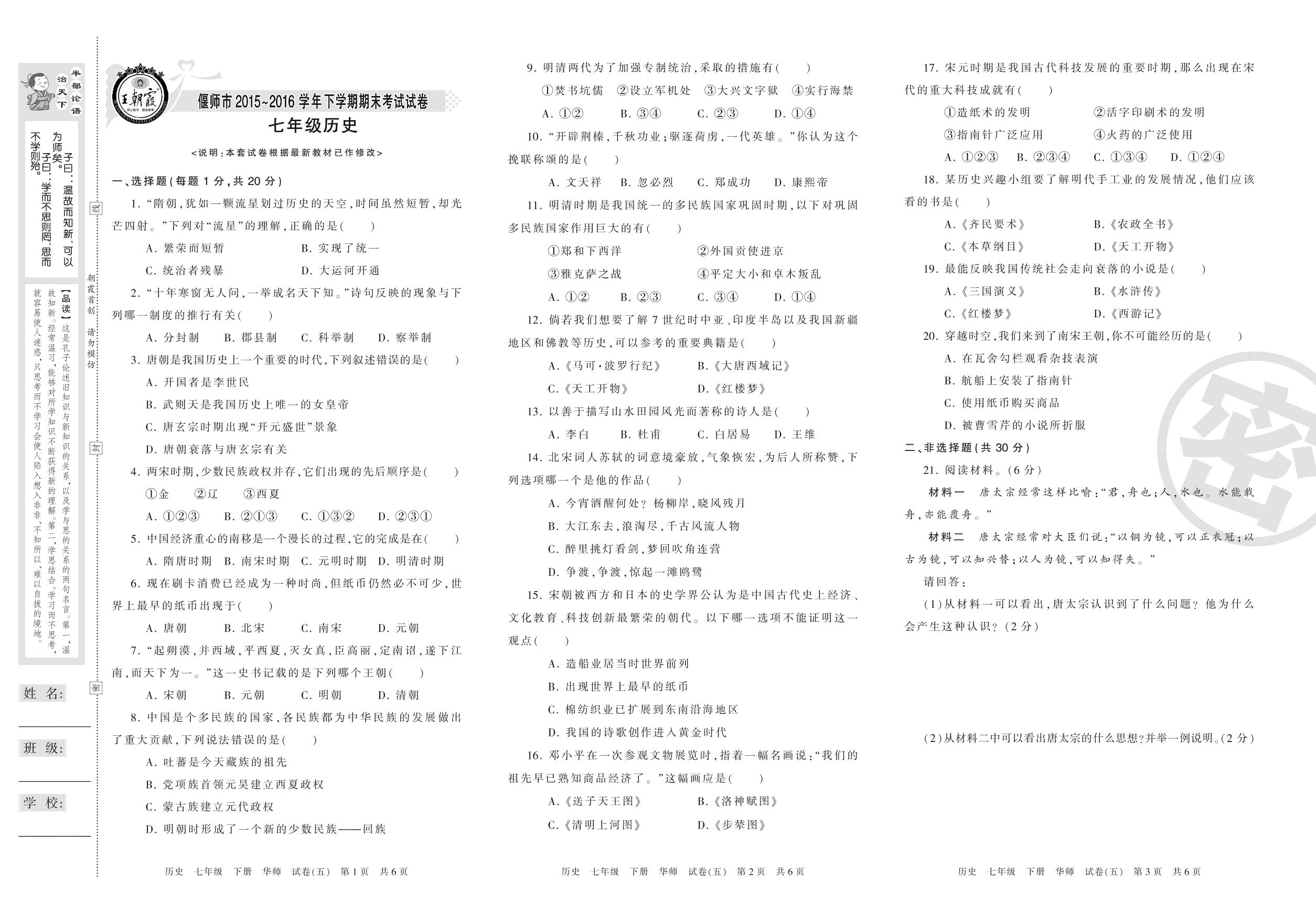2015-2016学年第二学期偃师市七年级历史试卷(华师版)【5】