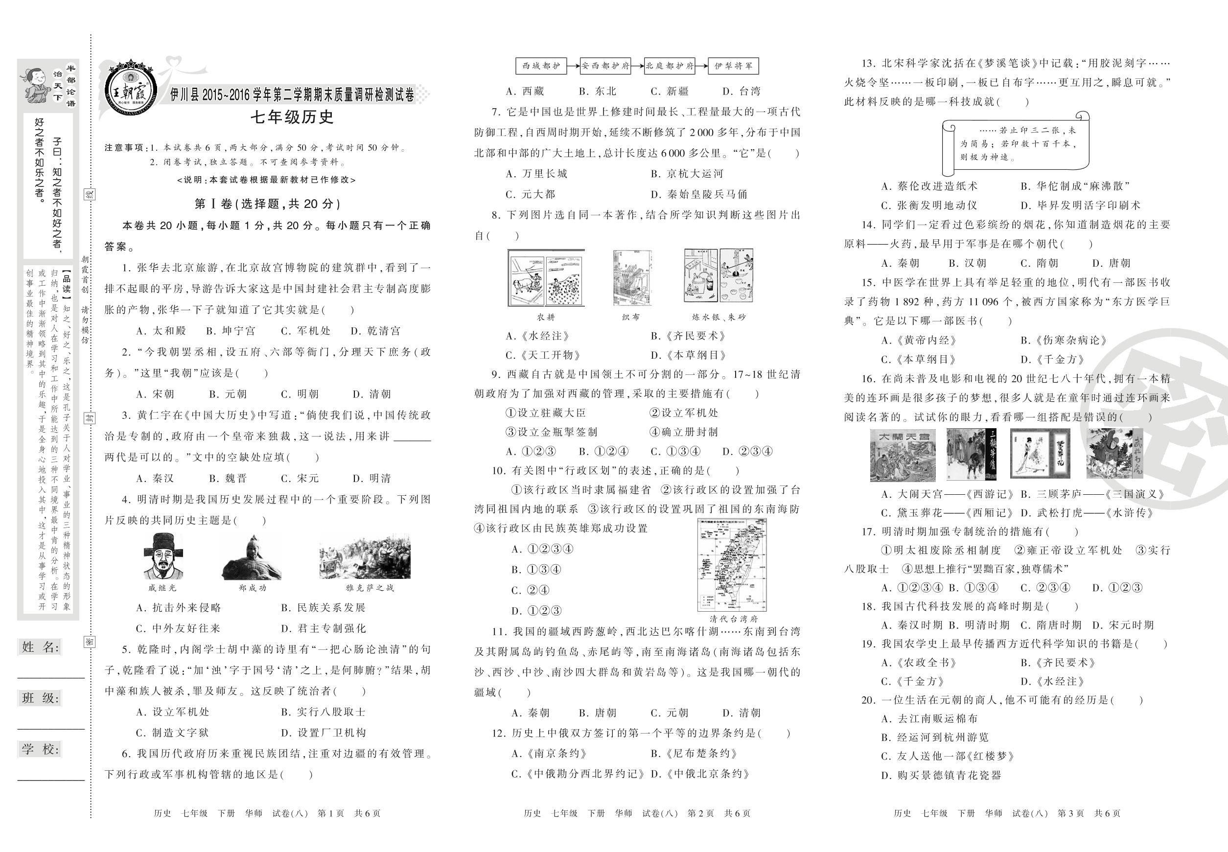 2015-2016学年第二学期洛阳市伊川县七年级历史试卷(华师版)【8】