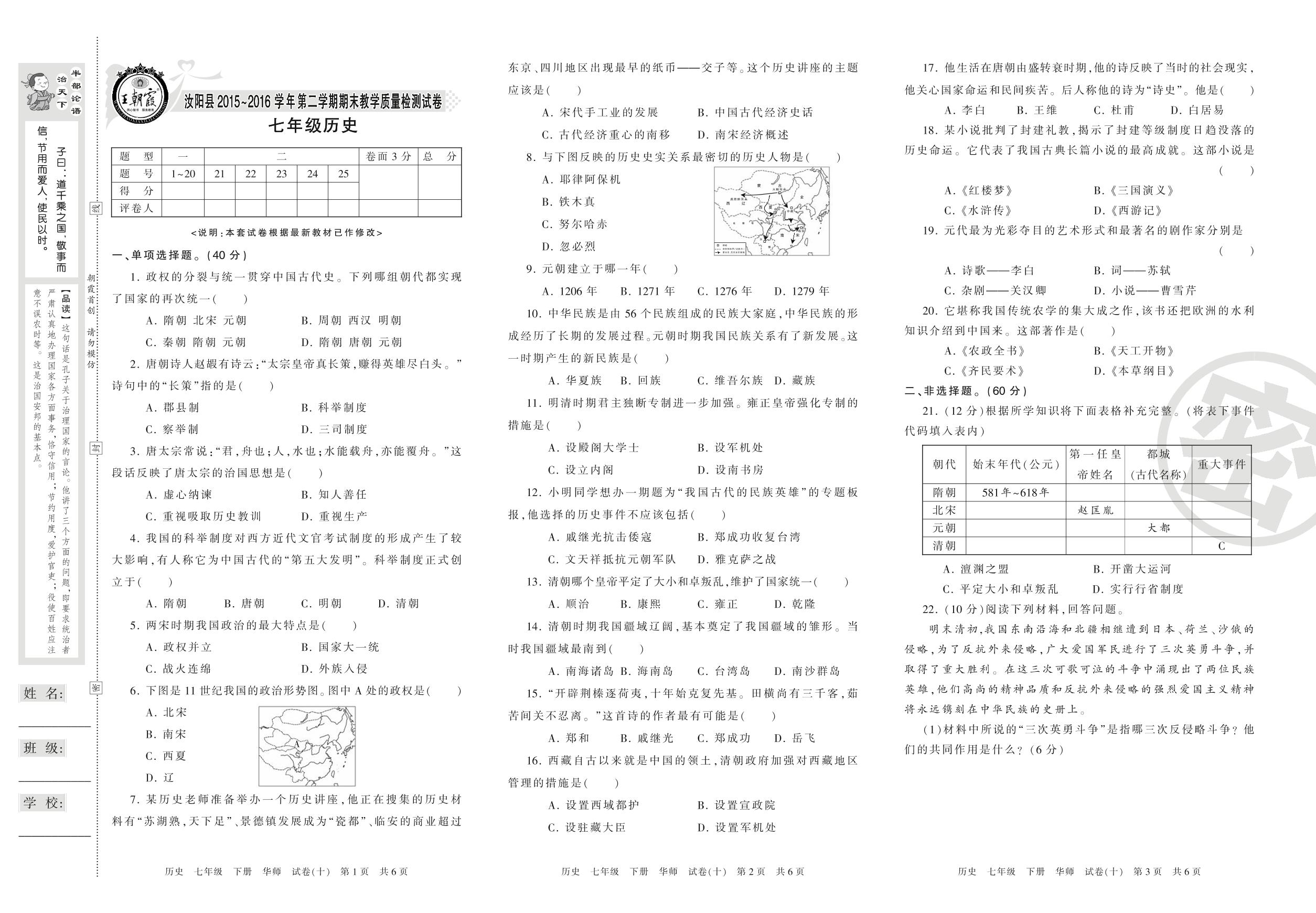 2015-2016学年第二学期洛阳市汝阳县七年级历史试卷(华师版)【10】