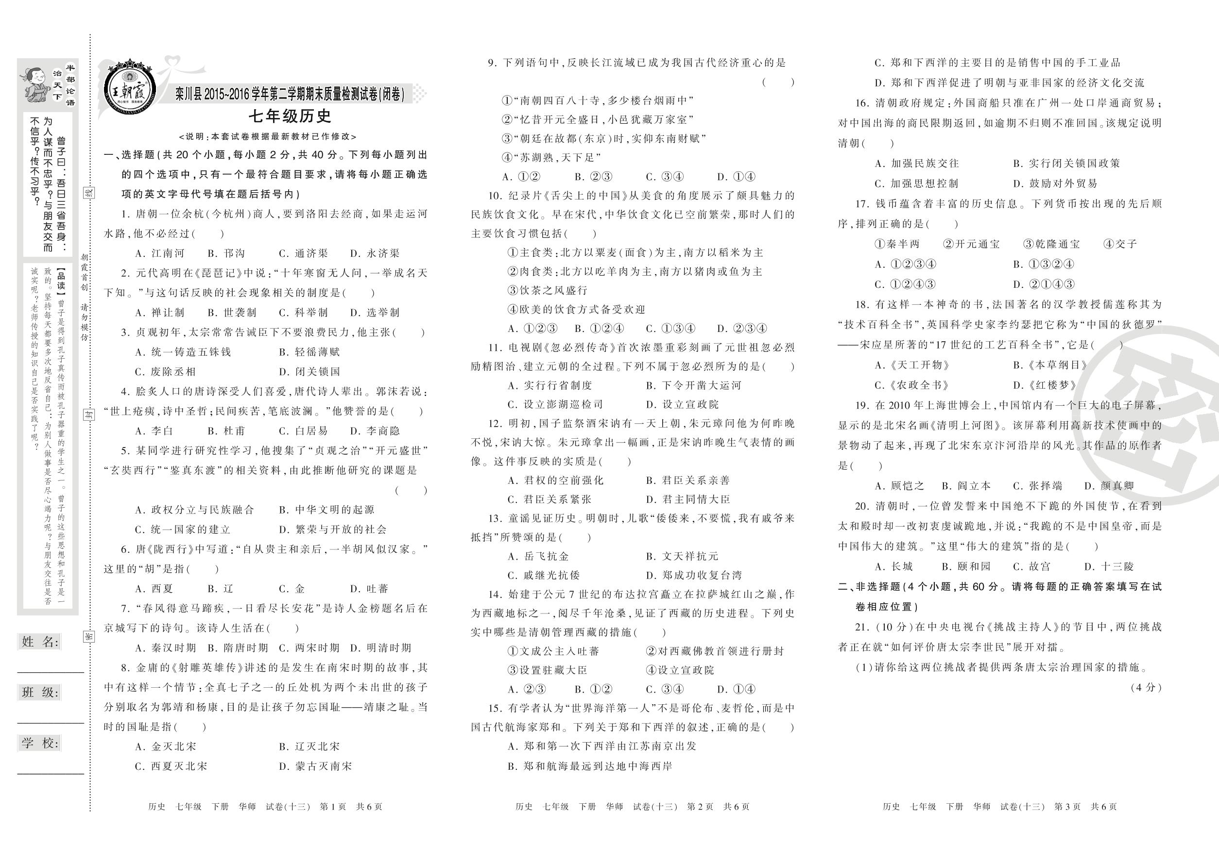 七年级历史华师版下册期末卷